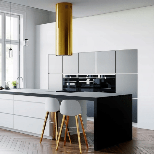 В нашем шоуруме KitchenMania представлены готовые варианты вытяжек от Falmec и Maunfeld в стильной матовой золотой отделке и в цвете медь, чёрный матовый, белый.