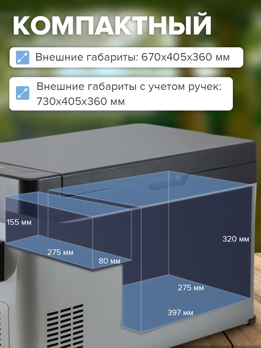 габариты основной камеры (Ш*Д*В): 27,5 × 39,7 × 32 см (до -25°); габариты дополнительной камеры, (ШхВхГ)