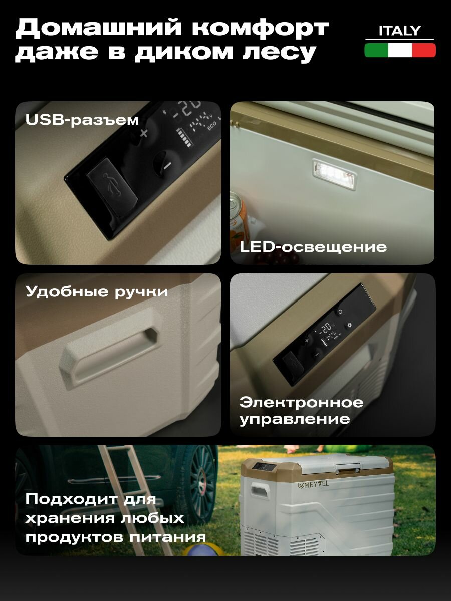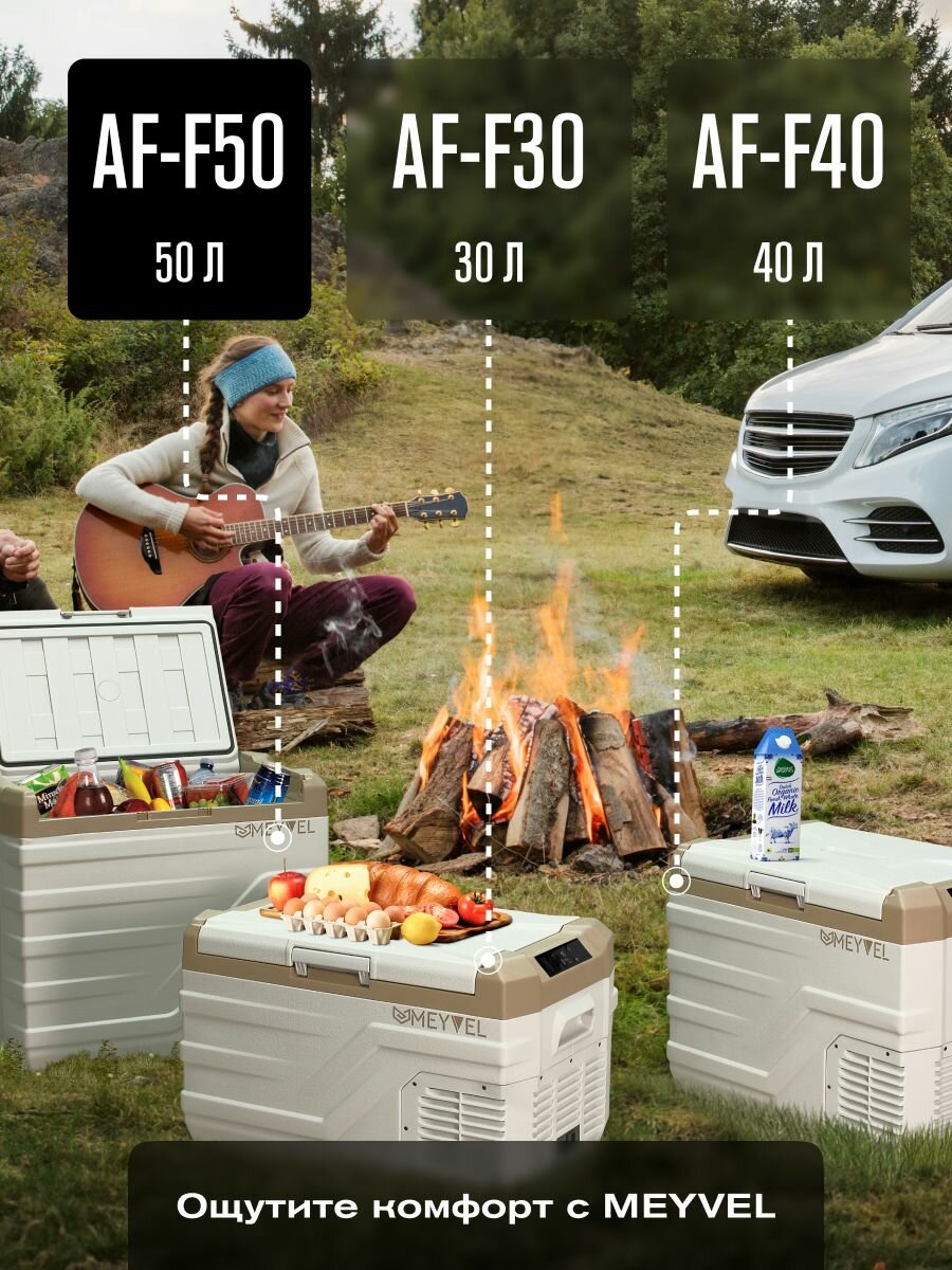 Компрессорный автохолодильник Meyvel AF-F50 - 1 шт. Кабель питания 12/24 В - 1 шт. Инструкция пользователя - 1 шт.