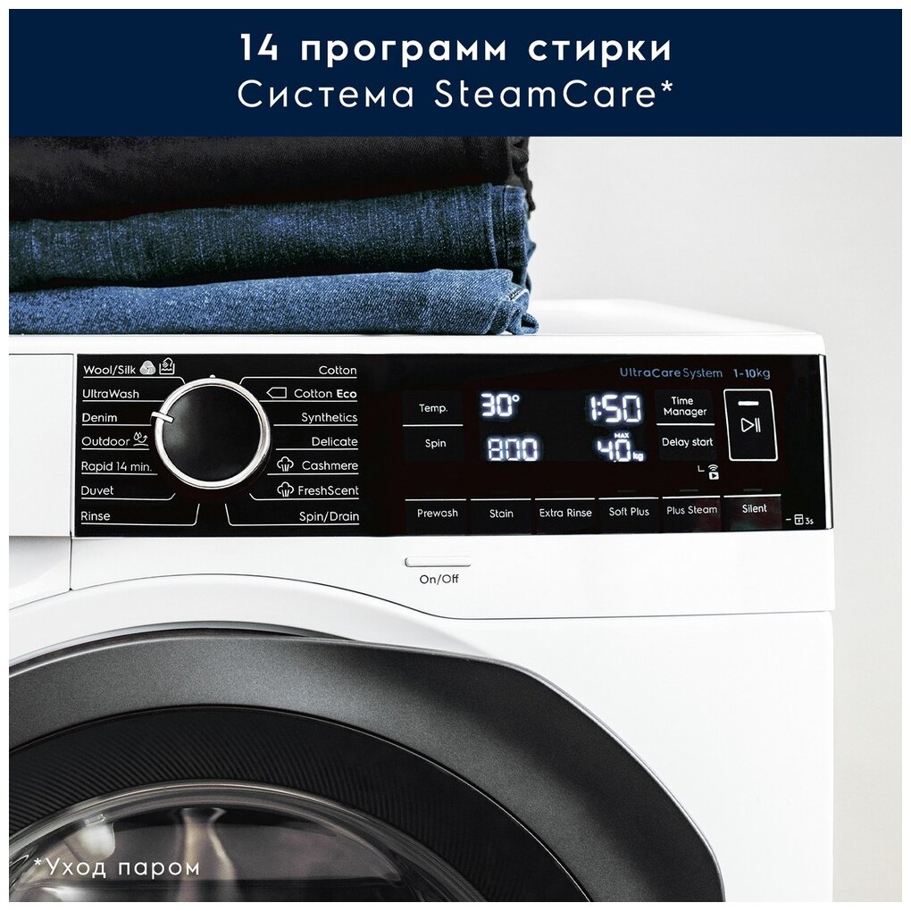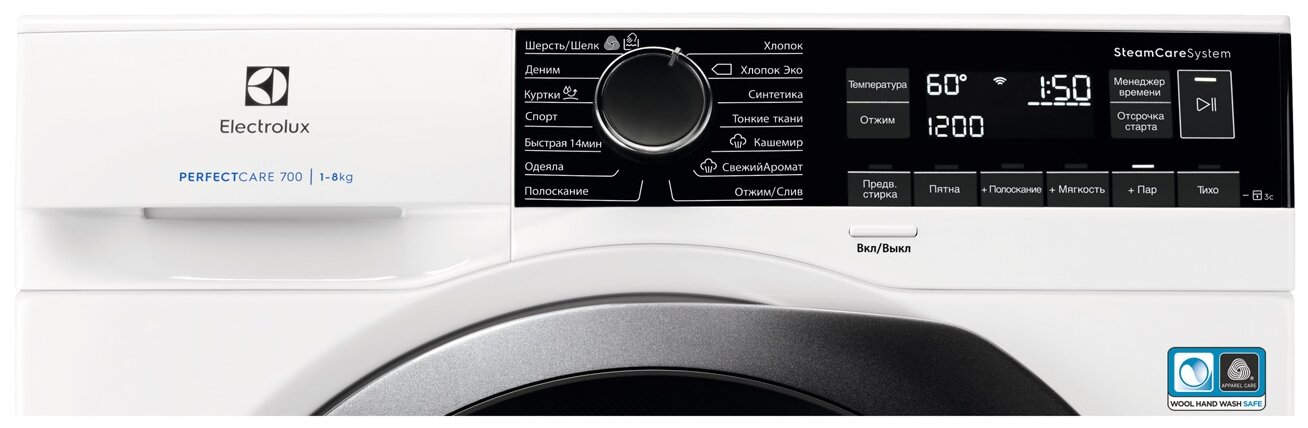 быстрая стирка, отжим, полоскание, стирка одеяла, стирка синтетики, стирка хлопка, стирка шерсти, Steam Cashmere, Вкл/Выкл, Деликатная стирка, Деним, Куртки, Пуховые одеяла, СвежийАромат + Пар, Спорт, Хлопок Эко, Шерсть/Шелк, быстрая 14 мин, деним, кашемир, куртки, свежий аромат, спорт, тонкие ткани, хлопок Эко, шерсть/шелк