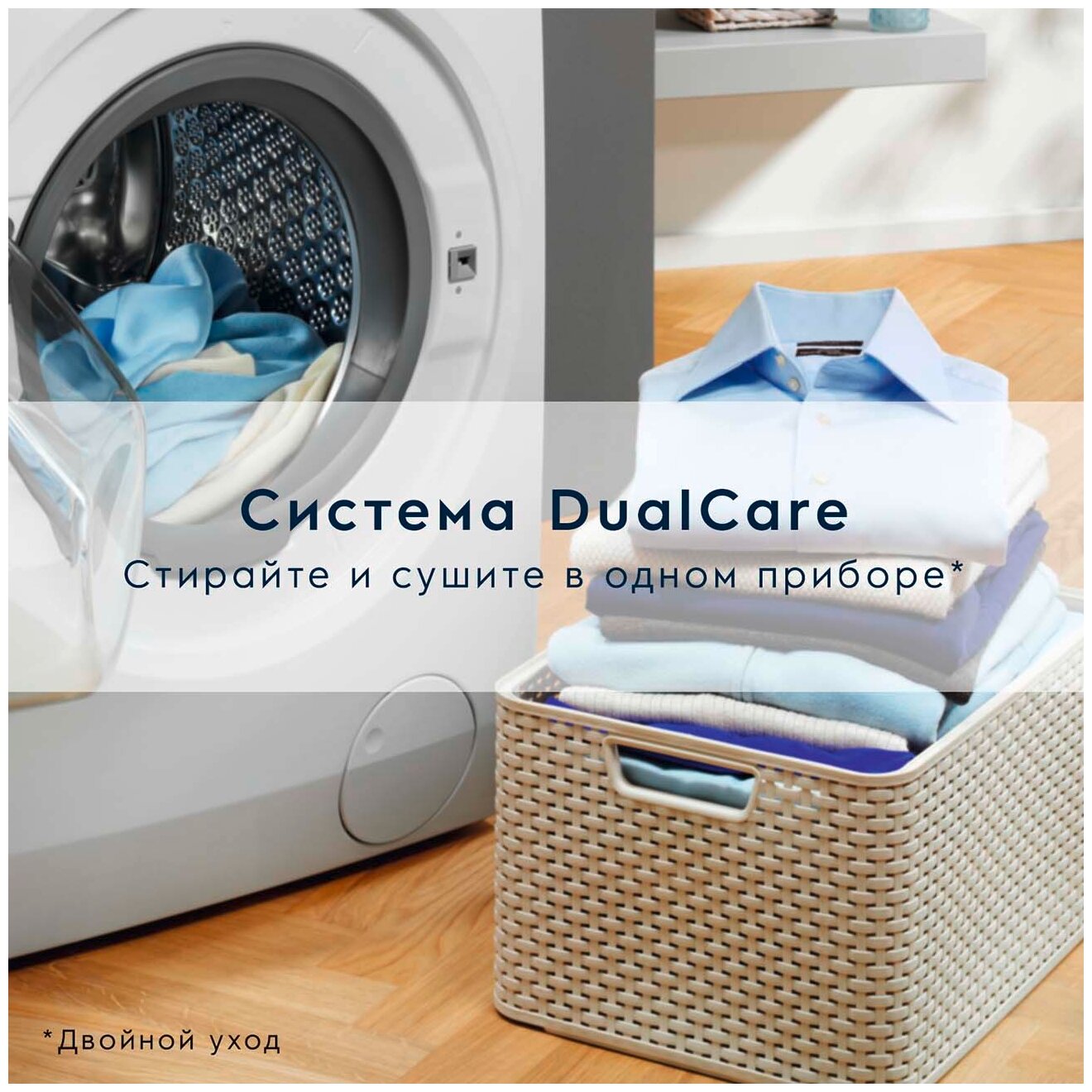 режимы: свежий аромат + пар, анти аллергия, очистка; Time Manager; двигатель инверторный с постоянными магнитами; предохранители А: 10; регулируемые ножки; датчики: расходометр; устройство защиты от протечек: прессостат; длина шнура 1,8 м; конденсационная система сушки: жидкость конденсируется внутри машины и сразу отводится в слив; контроль сушки: авто + сушка по времени; остаточная влажность после отжима: 0