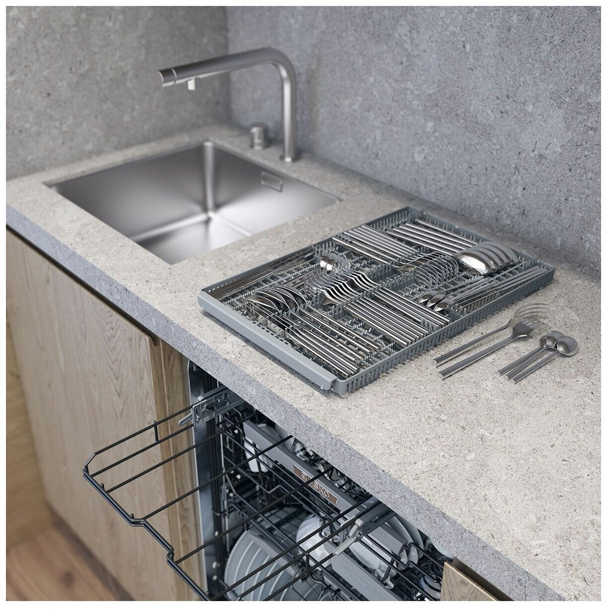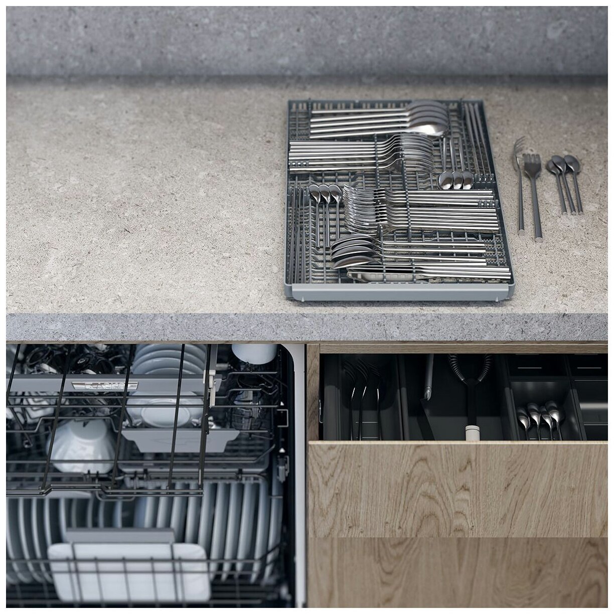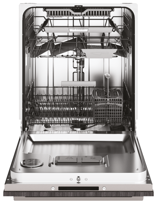 В камере посудомоечной машины находится три корзины, вмещающих 14 стандартных комплектов загрязнённой посуды. Верхнее отделение оснащено телескопическими направляющими и может изменяться по высоте размещения. В нижнюю корзину можно загружать предметы небольших и средних размеров. Также предусмотрен отсек для столовых приборов – вилок, ножей, ложек.