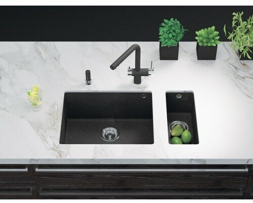 - Помимо гранита, в состав материала входит молотый кварц мельчайших размеров, которому характерны непревзойденная прочность и устойчивость к природным и химическим воздействиям. Свойства данного компонента вместе с долговечностью гранита обеспечивают мойке прочность и делают её устойчивой к любым механическим повреждениям: деформациям, сколам;