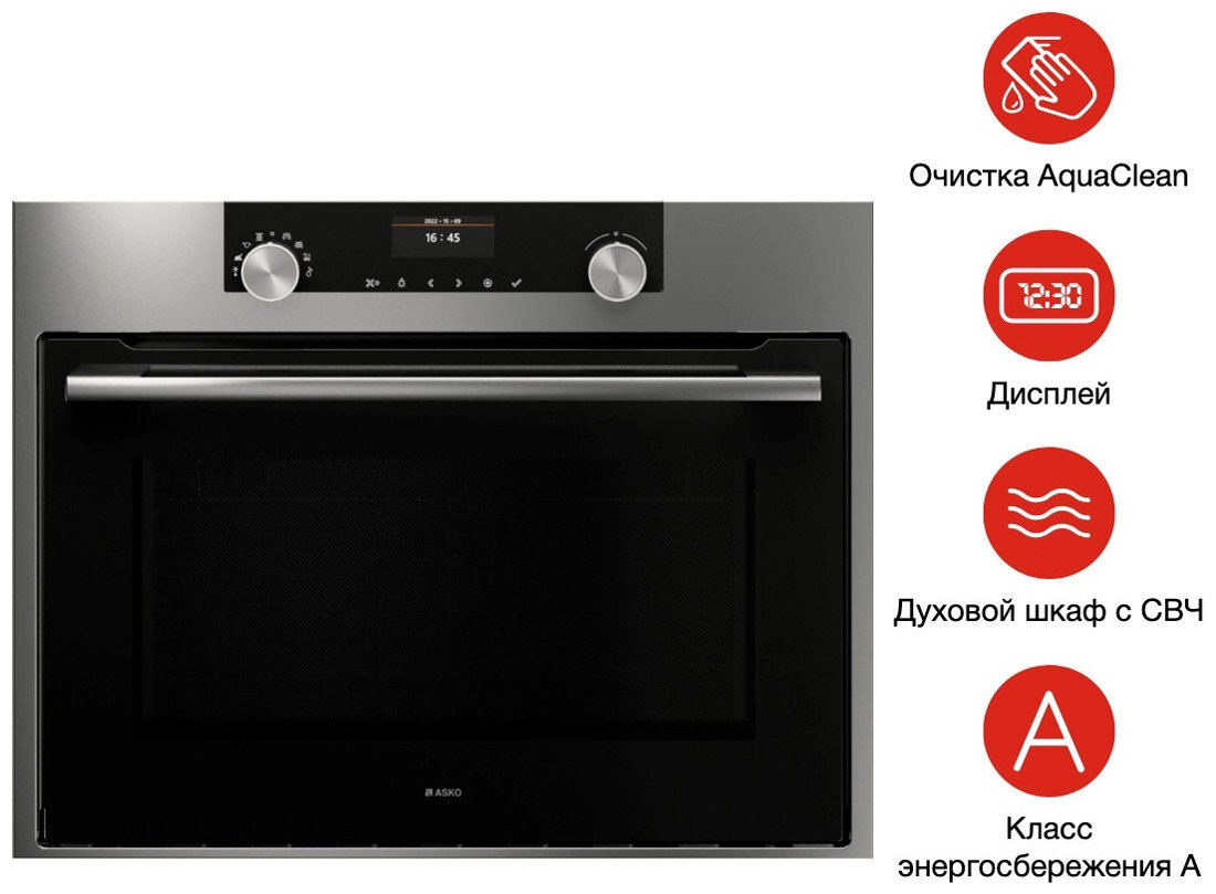 Asko OCM8464S является мультифункциональным устройством, в котором объединены преимущества сразу двух приборов – электрической духовки и СВЧ-печи.