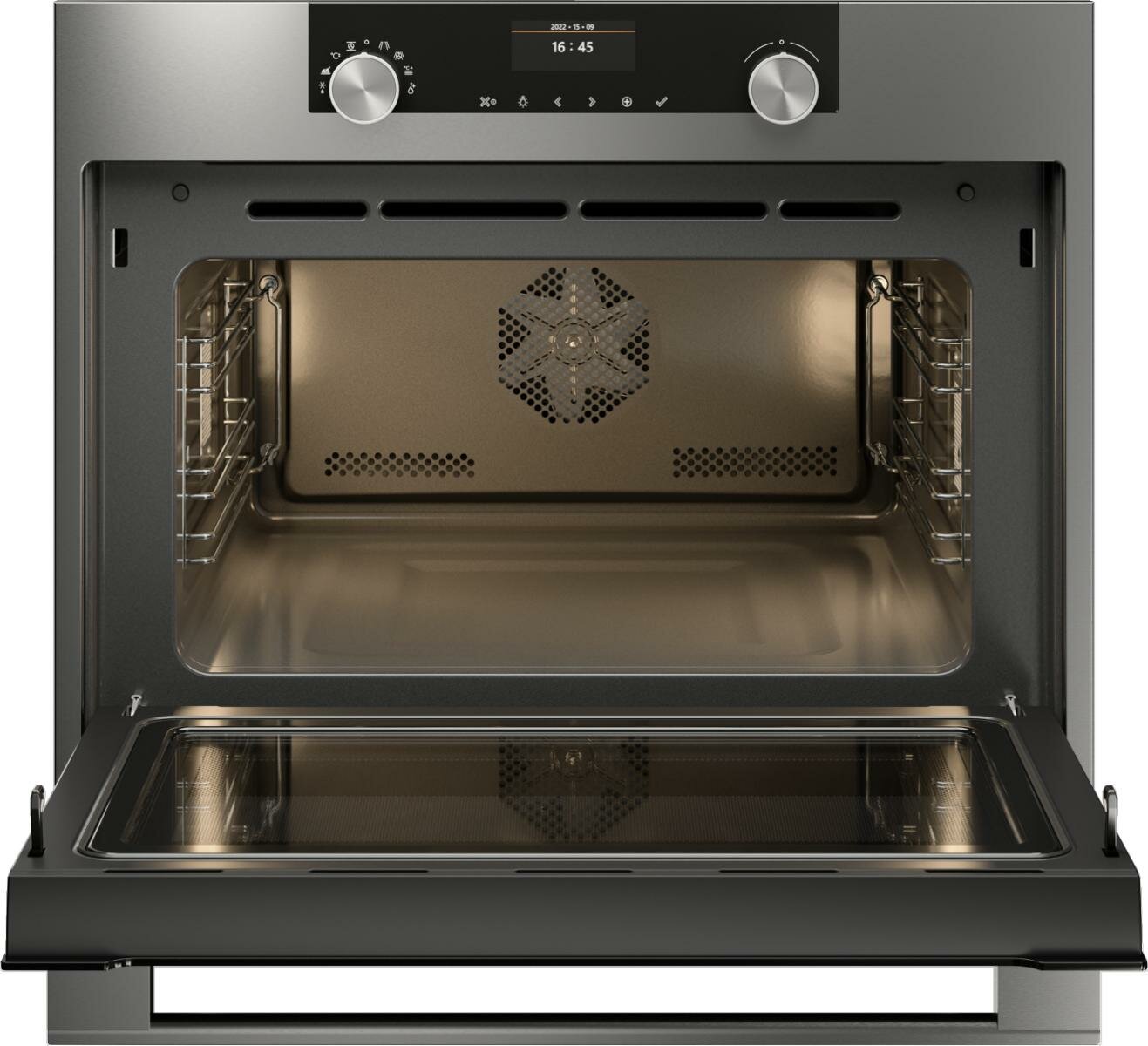 Asko OCM8464S не зря называется мультифункциональным комбинированным духовым шкафом. Пользователю действительно доступны разные полезные функции, такие как быстрый нагрев рабочего пространства, приготовление микроволнами без вращения, СВЧ-система инверторного типа, трёхмерная конвекция воздухом с высокой температурой. Дверь открывается максимально плавно и не нагревается благодаря особой конструкции с тремя стёклами. Освещение с двух сторон поможет всегда видеть, что происходит в камере, и насколько блюдо готово.