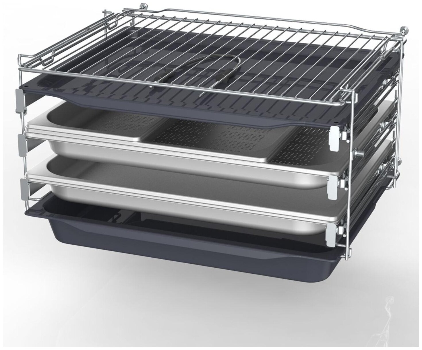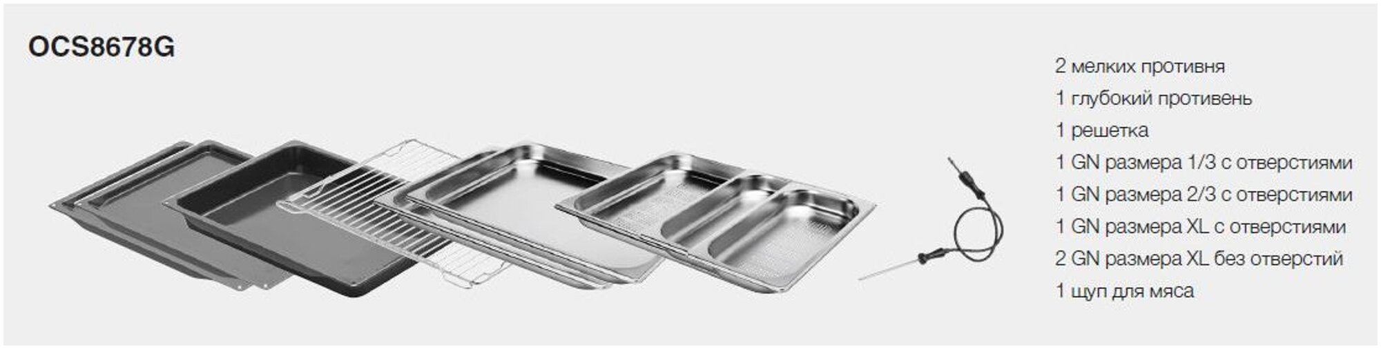 решетка, глубокий противень, температурный зонд, 2 мелких противня, 2 GN размера XL без отверстий, 1 GN размера XL с отверстиями, 1 GN размера 2/3 с отверстиями, 1 GN размера 1/3 с отверстиями