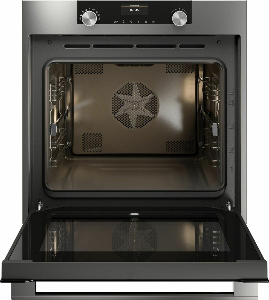 Объём рабочей камеры составляет целых 73 литра, всё её пространство поделено на пять уровней, а на одном уровне предусмотрены телескопические эргономичные направляющие.