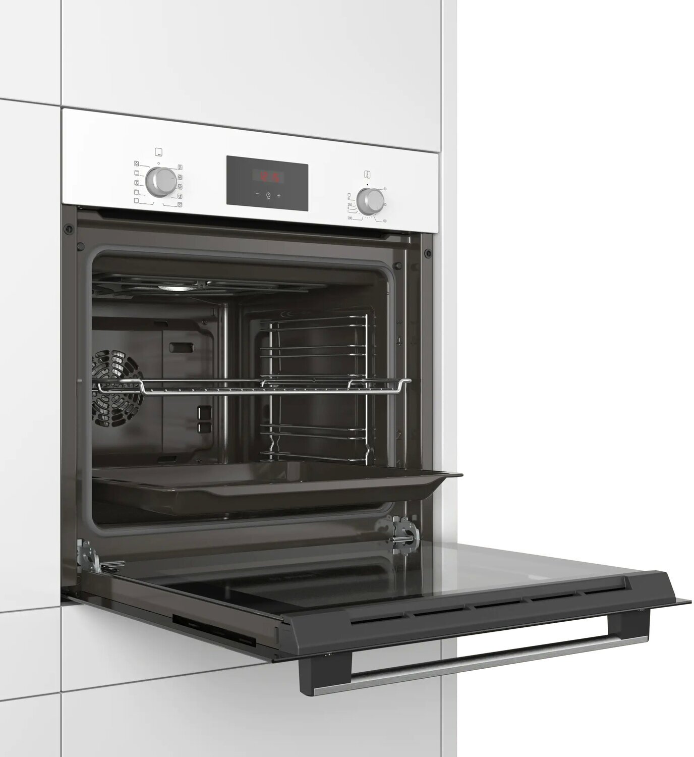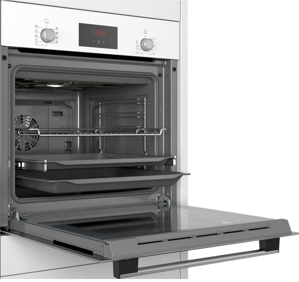 дополнительные режимы: 3D горячий воздух, горячий воздух gentle, режим для пиццы; телескопические направляющие на 1 уровне; LED-дисплей c индикацией красного цвета; многофункциональные электронные часы EasyClock включают в себя бытовой таймер, таймер приготовления, установку окончания приготовления; дверная ручка; галогенное внутреннее освещение; система охлаждения прибора позволяет встроить в любой кухонный гарнитур; длина сетевого кабеля: 100 см, тип штепсельной вилки: вилка с заземлением; предохранители: 16 A, напряжение: 220-240 В, размеры ниши для встраивания 575-597x560-568x550 мм, вес без упаковки - 31,098 кг