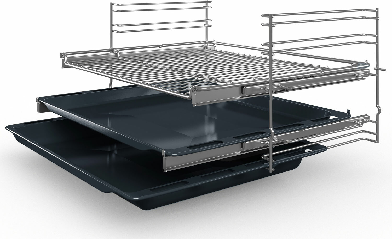быстрый нагрев, Вентилятор охлаждения, Встроенные часы, Двухуровневое приготовление, Дисплей, Доводчик дверцы духовки, Хромированные направляющие