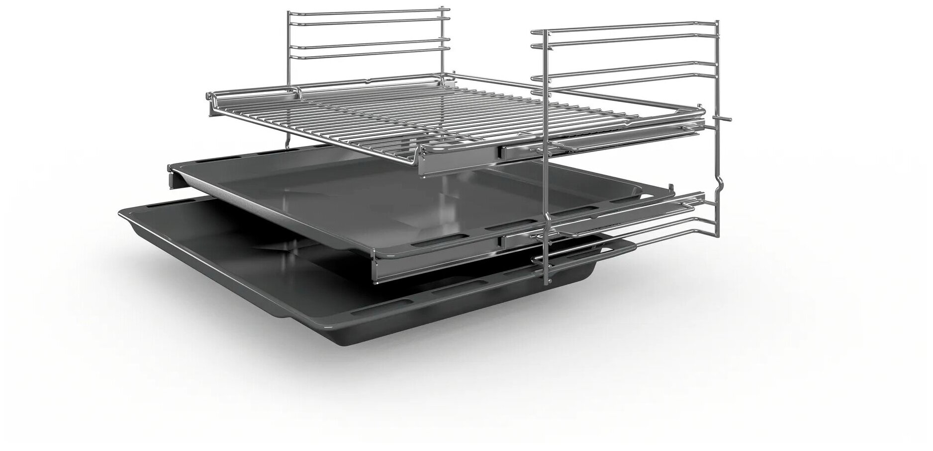 Телескопические направляющие (2-уровневые), Универсальный противень, Эмалированный противень, Комбинированная решетка, Выдвижная тележка духовки: 2-level