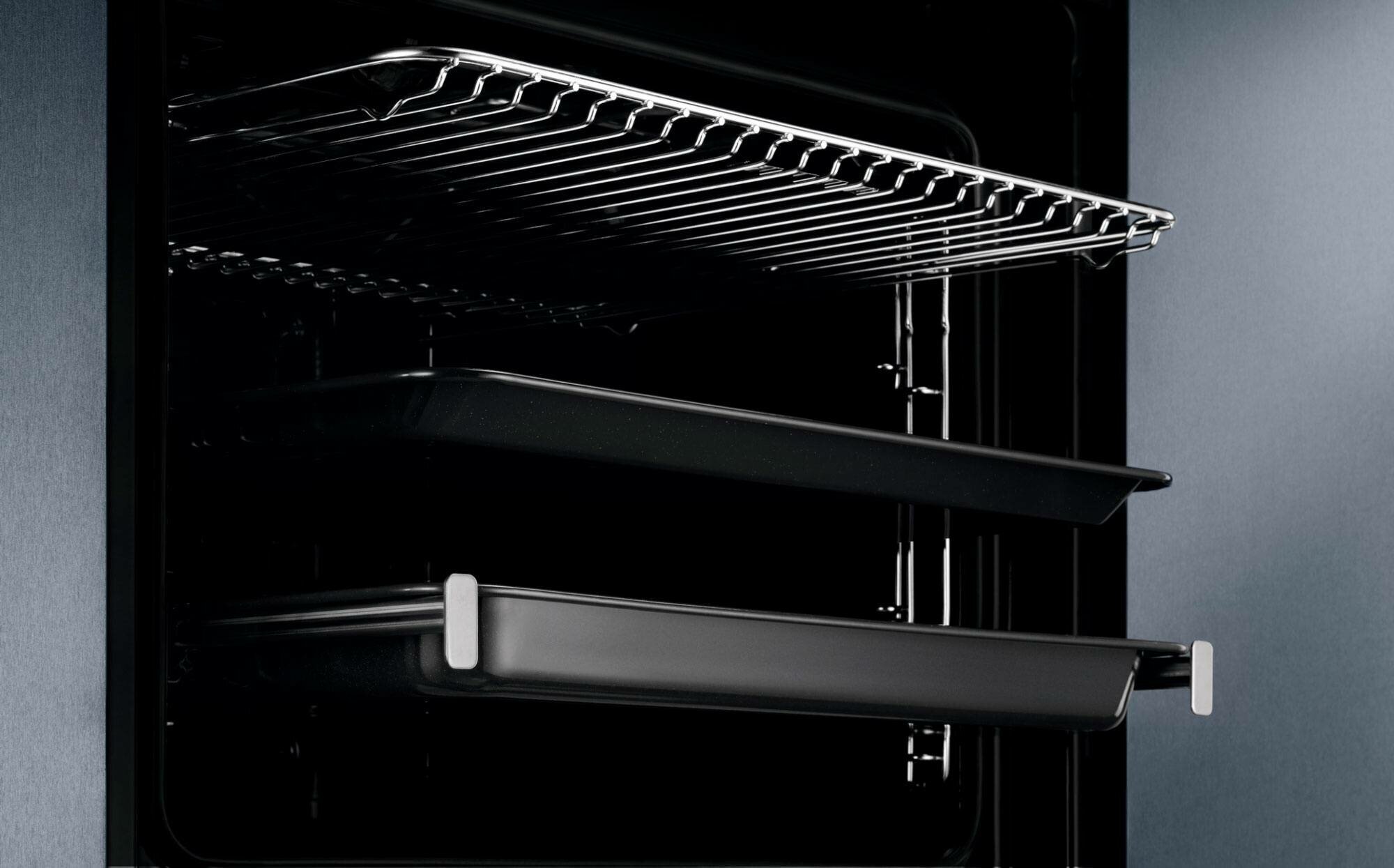 быстрый нагрев, размораживание, таймер, Вентилятор охлаждения, Встроенные часы, Двухуровневое приготовление, Дисплей, Доводчик дверцы духовки, Защитное покрытие от отпечатков пальцев, Термощуп, Хромированные направляющие