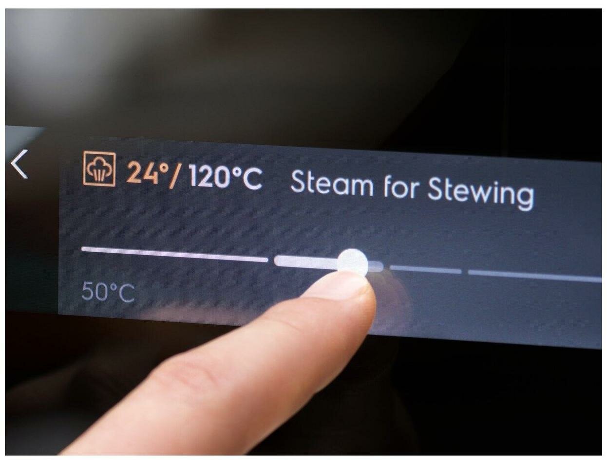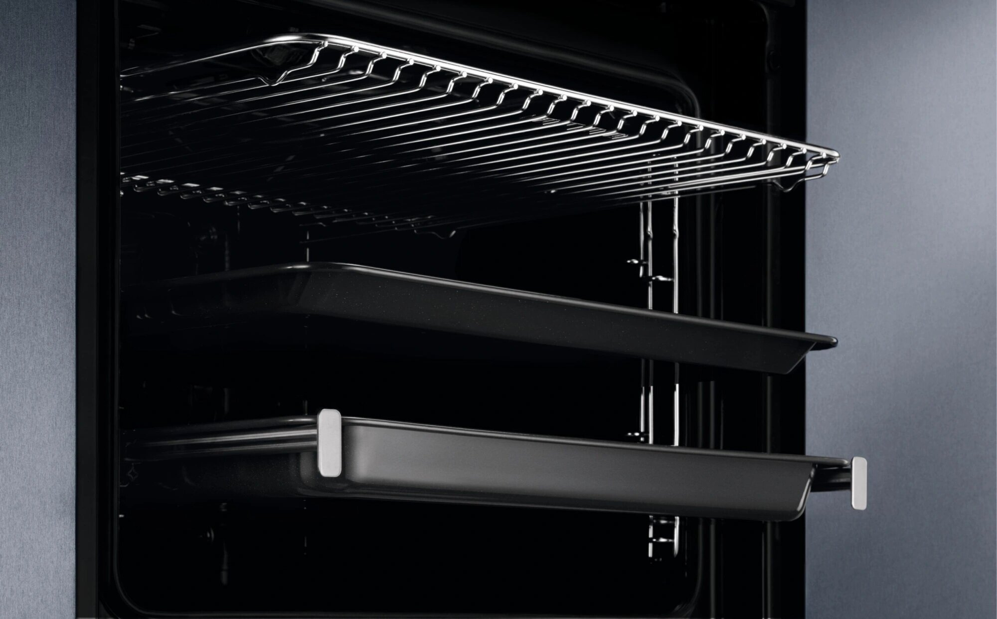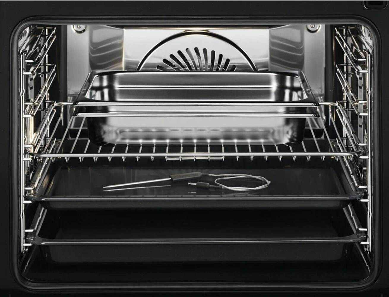 тип направляющих: легкосъемные Easy Entry, из нержавеющей стали, аксессуары: поддон с эмалью легкой очистки, набор для приготовления на пару, 2 эмалированных противня, 1 хромированная решетка, датчик влажности, емкость для воды 950 мл; тип часов: электронные; вентилятор охлаждения; тип таймера: звуковой с отключением