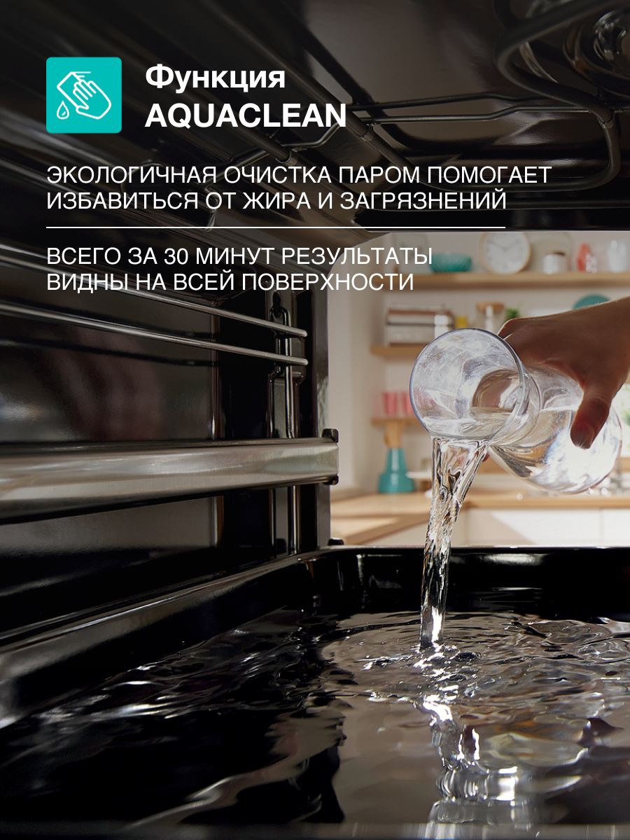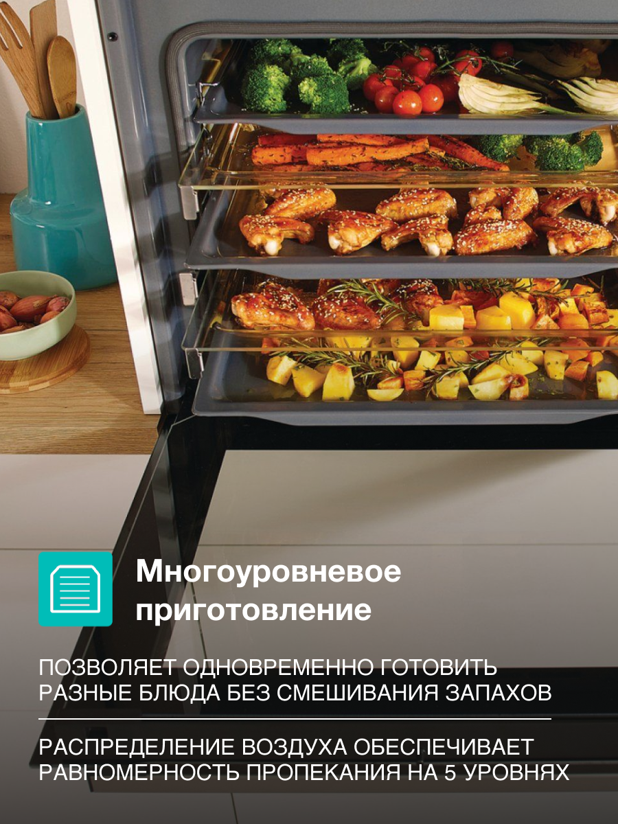 быстрый нагрев, размораживание, таймер, Вентилятор охлаждения, Встроенные часы, Двухуровневое приготовление, Динамическая система охлаждения DC, Дисплей, Защитная сетка, Максимальная площадь приготовления SuperSize, Медленное приготовление SlowBake/GentleBake, Многоуровневое приготовление, Окончание приготовления, Полностью стеклянная внутренняя дверца, Продолжительность приготовления, Просторная духовка BigSpace, Ручки PushPull, Хромированные направляющие
