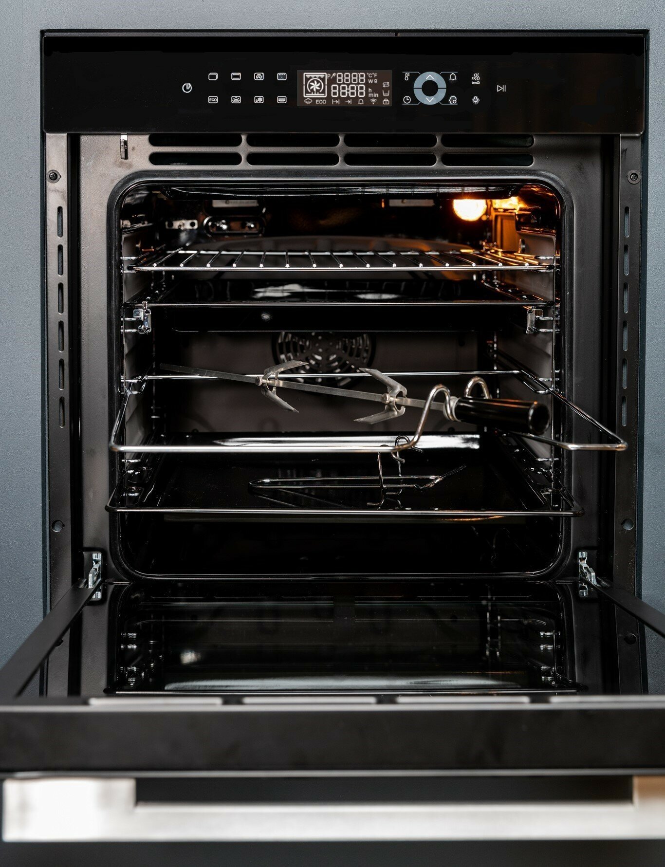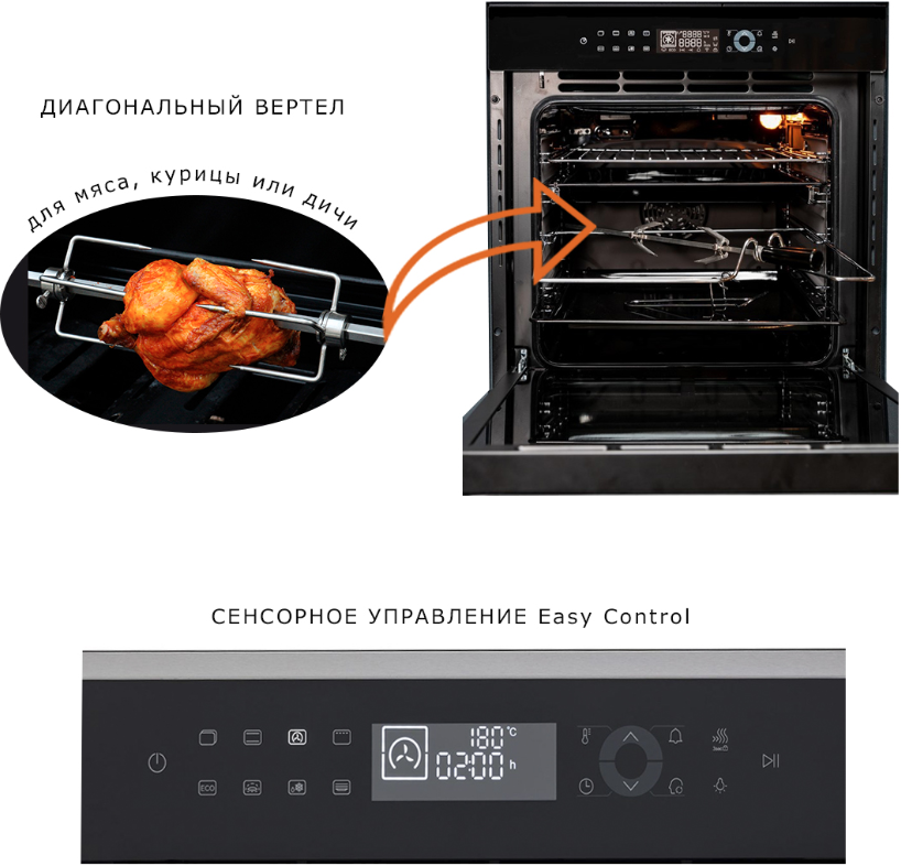 быстрый нагрев, размораживание, таймер, Вентилятор охлаждения, Встроенные часы, Двухуровневое приготовление, Дисплей, Доводчик дверцы духовки, Отложенный запуск, Полностью стеклянная внутренняя дверца, Термощуп, Установка времени окончания приготовления, Функция памяти, Хромированные направляющие, Электромеханический вертел, размораживание, таймер