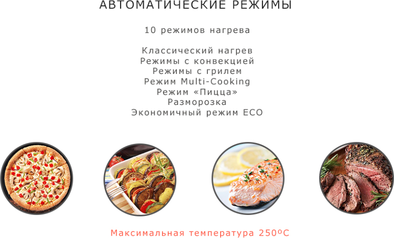 большой гриль, верхний нагрев, верхний нагрев + нижний нагрев, гриль, гриль + конвекция, конвекция, нижний нагрев, нижний нагрев + конвекция, Вертел, Верхний + нижний нагрев + конвекция, Гриль + вентилятор, Гриль + нижний нагрев, Нижний нагрев + Турбо (Пицца), Размораживание, Турбо режим