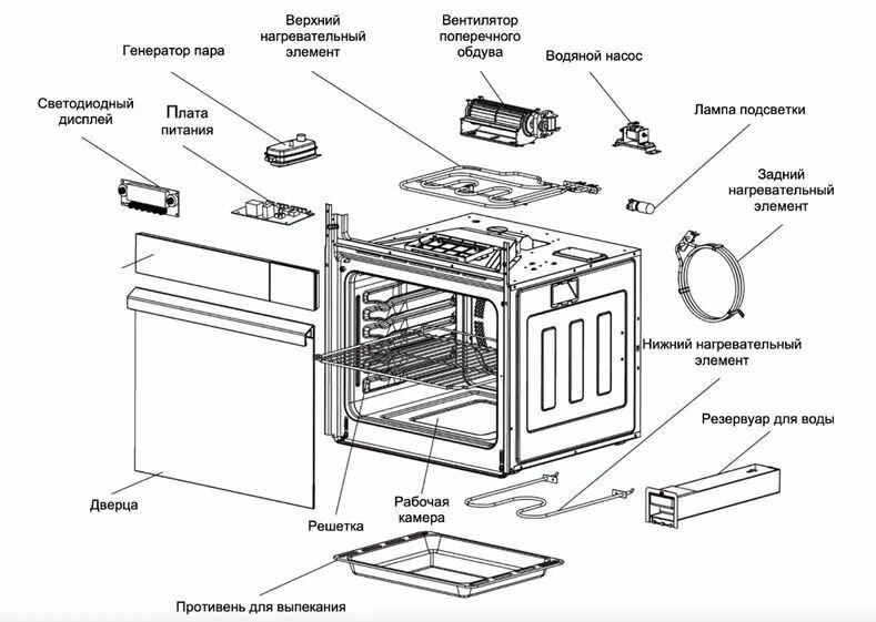 большой гриль, верхний нагрев, верхний нагрев + нижний нагрев, гриль, гриль + конвекция, конвекция, нижний нагрев, нижний нагрев + конвекция, Верхний + нижний нагрев + конвекция, Верхний нагрев с конвекцией, Конвекция с паром, Размораживание, Функция пара