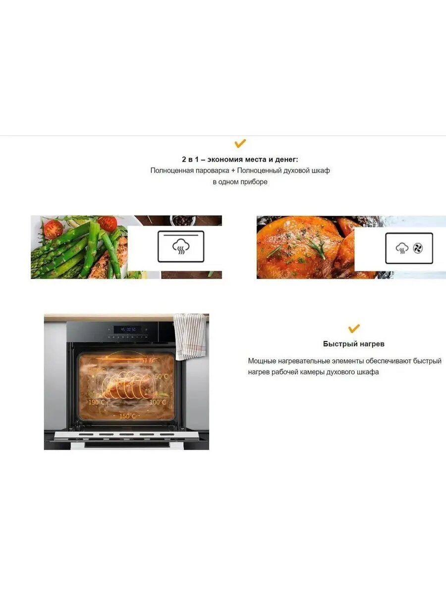 быстрый нагрев, добавление пара, поддержание тепла, размораживание, режим ферментации, таймер, функция TasteControl, функция пароварки, Встроенные часы, Дисплей