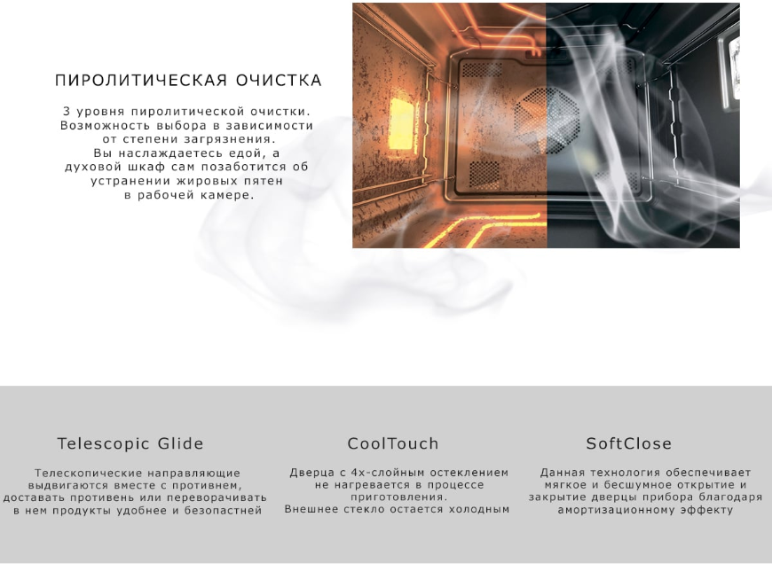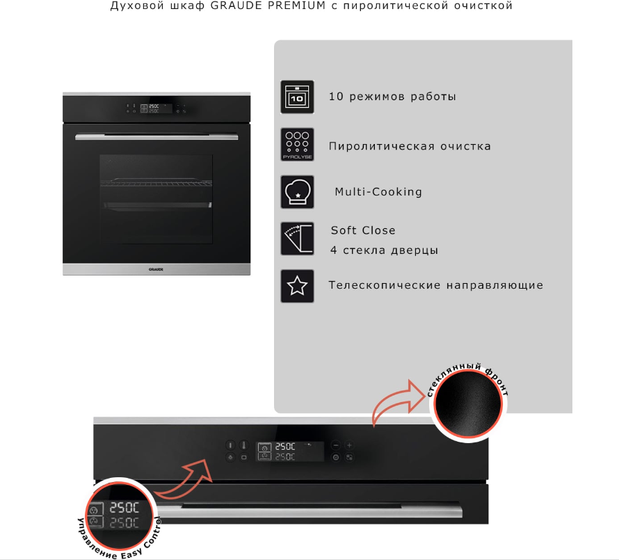 размораживание, таймер, Вентилятор охлаждения, Встроенные часы, Дисплей, Доводчик дверцы духовки, Отложенный запуск, Полностью стеклянная внутренняя дверца, Режим Multi-Cooking, Установка времени окончания приготовления, Функция памяти, Хромированные направляющие