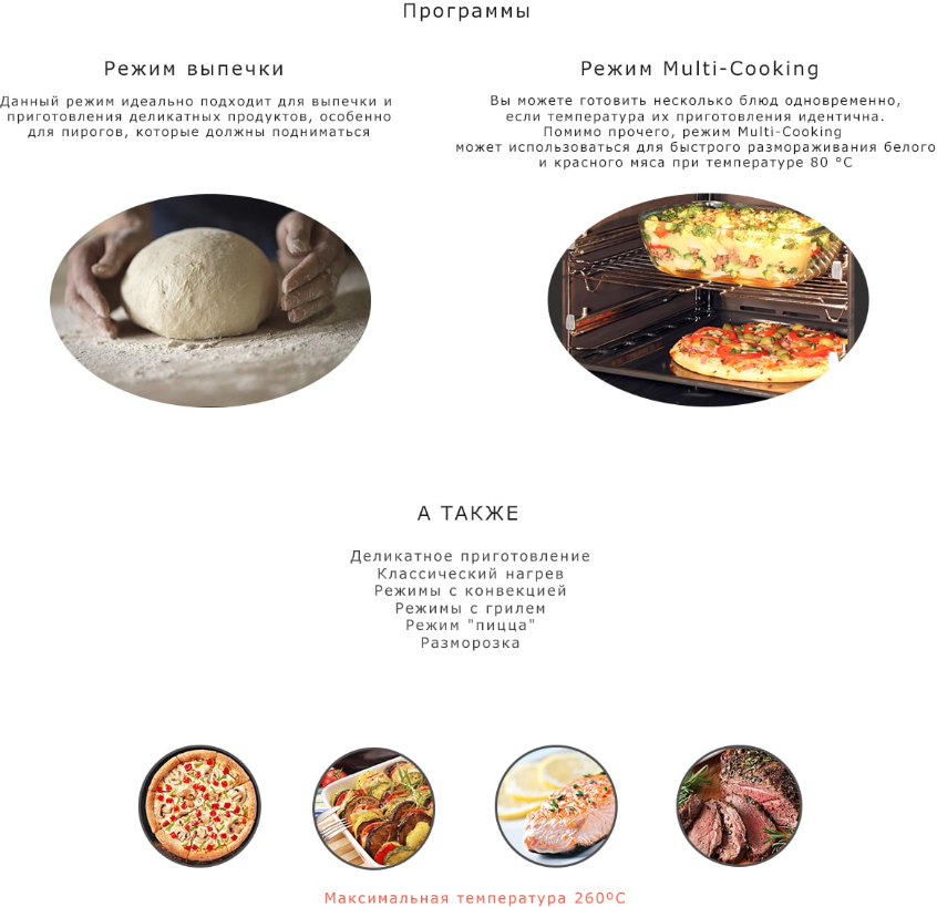 верхний нагрев, верхний нагрев + нижний нагрев, гриль, гриль + конвекция, конвекция, нижний нагрев, нижний нагрев + конвекция, Верхний + нижний нагрев + конвекция, Верхний и нижний нагрев с конвекцией, Гриль + вентилятор, Нижний нагрев + Турбо (Пицца), Нижний нагрев с кольцевым нагревом и конвекцией, Размораживание, Режим Multi-Cooking
