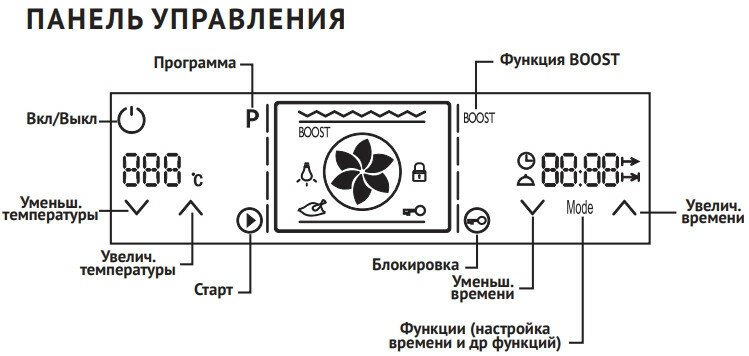 большой гриль, верхний нагрев, верхний нагрев + нижний нагрев, гриль + конвекция, конвекция, малый гриль, нижний нагрев, Большой турбо гриль, Большой турбогриль + Вертел, Вертел, Горячий воздух, Кольцевой элемент + вентилятор + выпариватель, Конвекционный нагрев, Конвекционный нагрев с грилем + Вертел, Малый турбогриль, Малый турбогриль + Вертел, Объемный турбогриль, Освещение, Размораживание, Традиционный нагрев, Турбо гриль