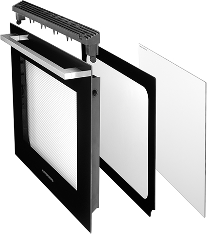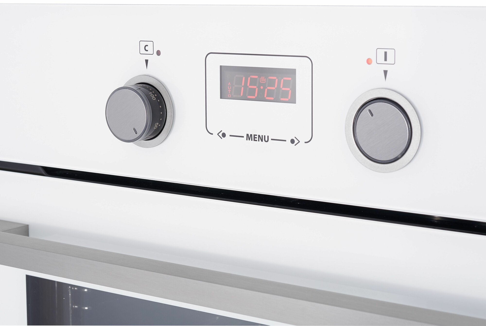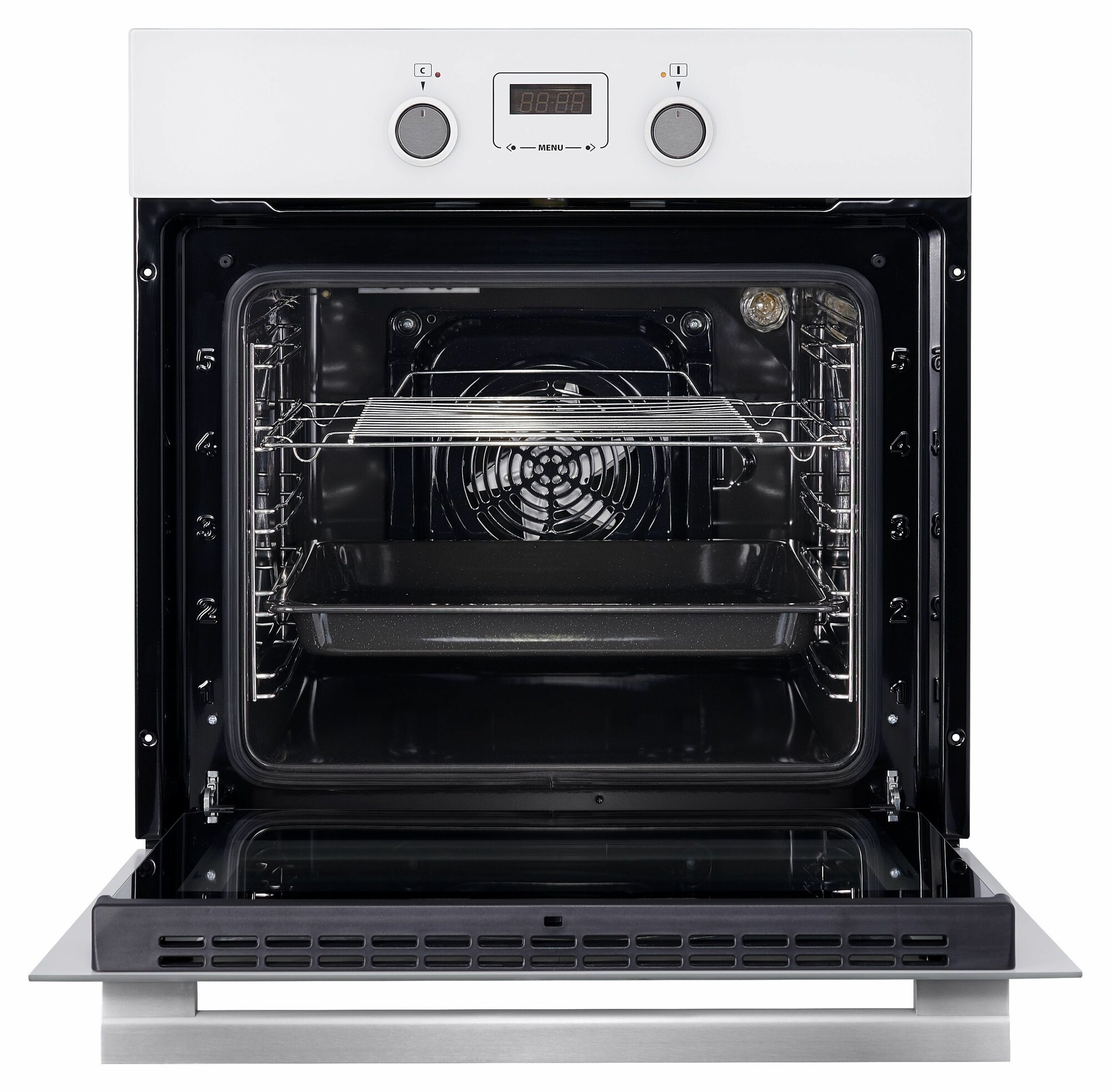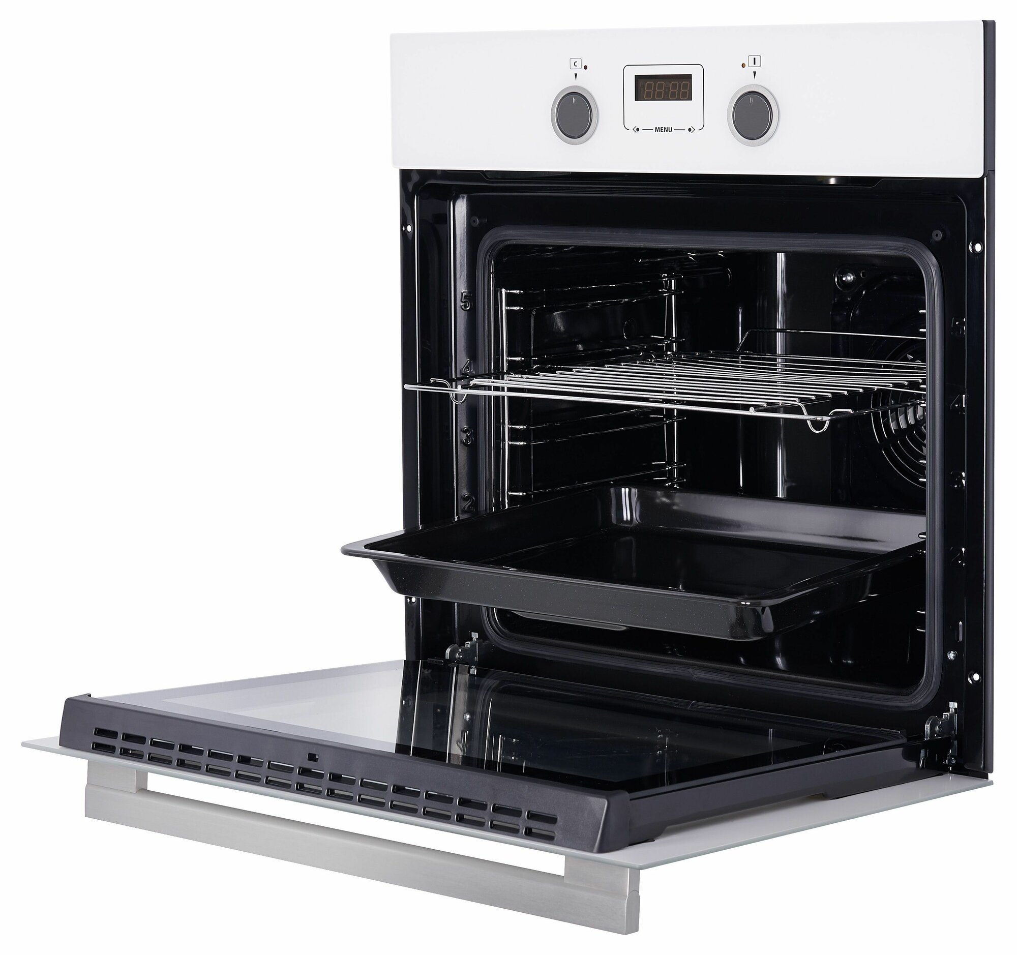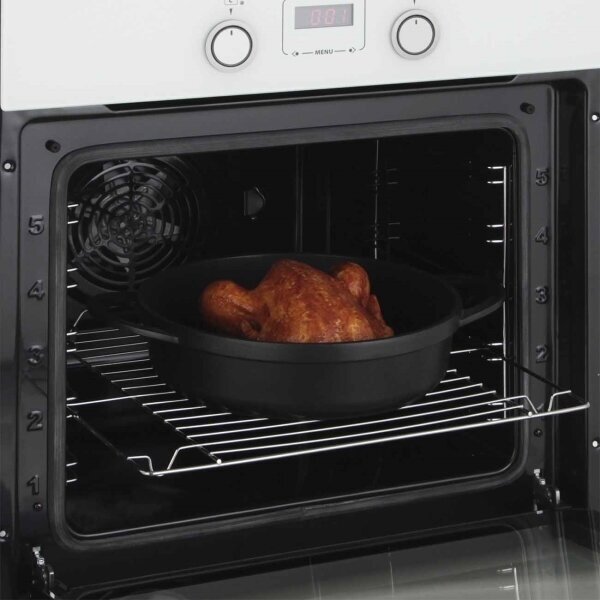макси-Гриль с конвекцией, традиционный нагрев с конвекцией; рецепты на внутреннем стекле; направляющие для противней хромированные, съемные; съемная дверца духового шкафа; съемное внутреннее стекло; размер ниши для встраивания под столешницу (ВхШхГ), мм 600×555×570; размер ниши для встраивания в колонну (ВхШхГ), мм 585(+10)x555×570; тип часов: электронные; вентилятор охлаждения