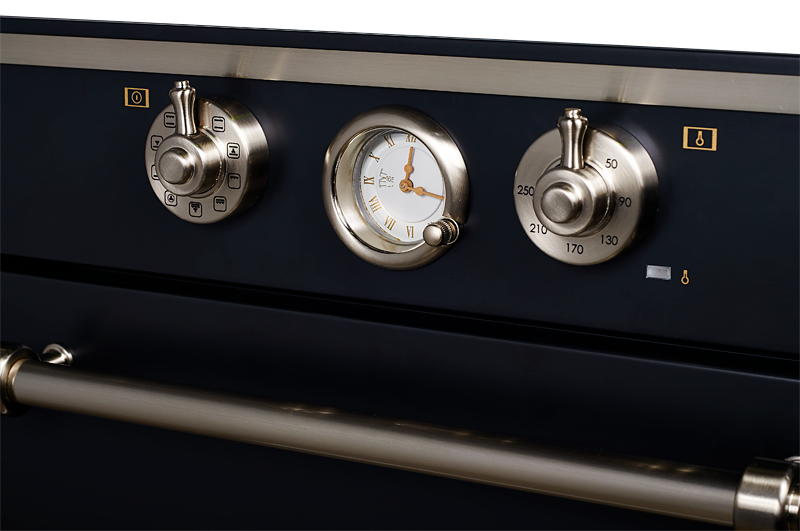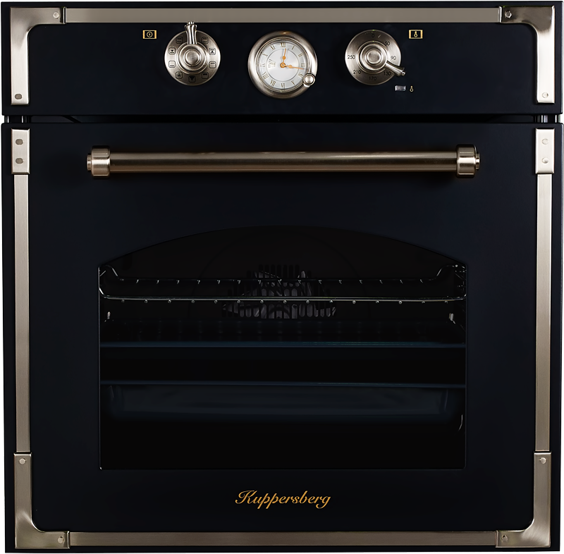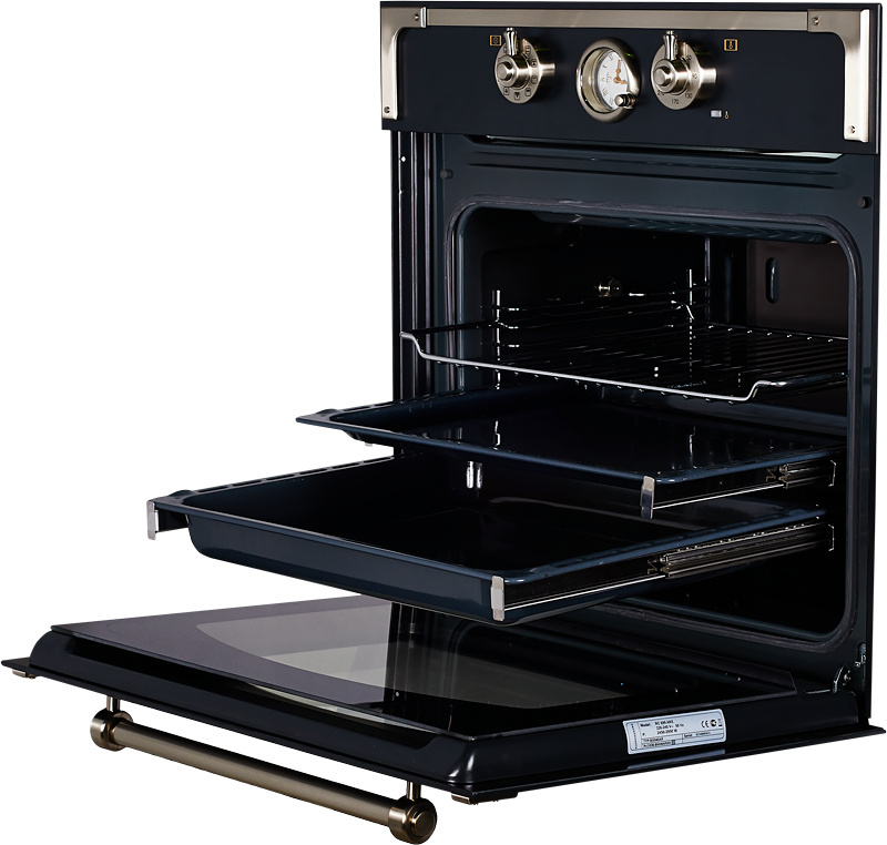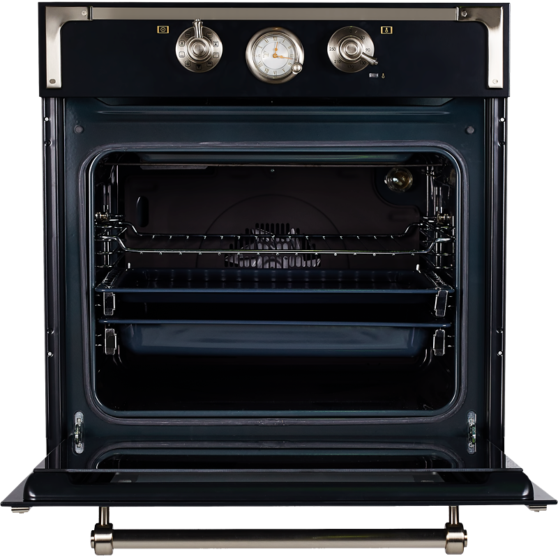 Встроенные часы, Двухуровневое приготовление, Дизайн Ретро, Доводчик дверцы духовки, Полностью стеклянная внутренняя дверца, Хромированные направляющие