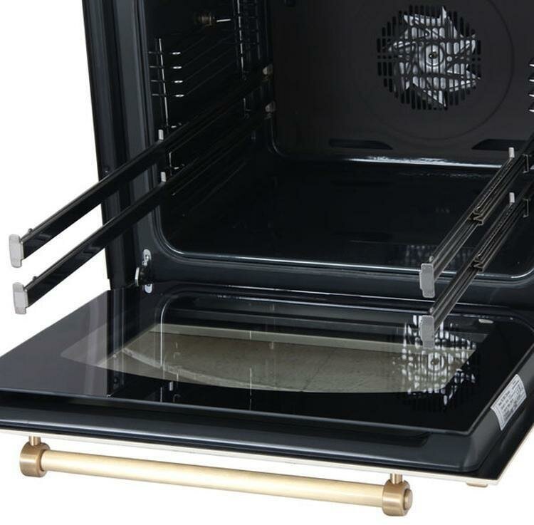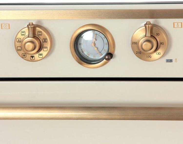 Встроенные часы, Двухуровневое приготовление, Дизайн Ретро, Доводчик дверцы духовки, Полностью стеклянная внутренняя дверца, Хромированные направляющие