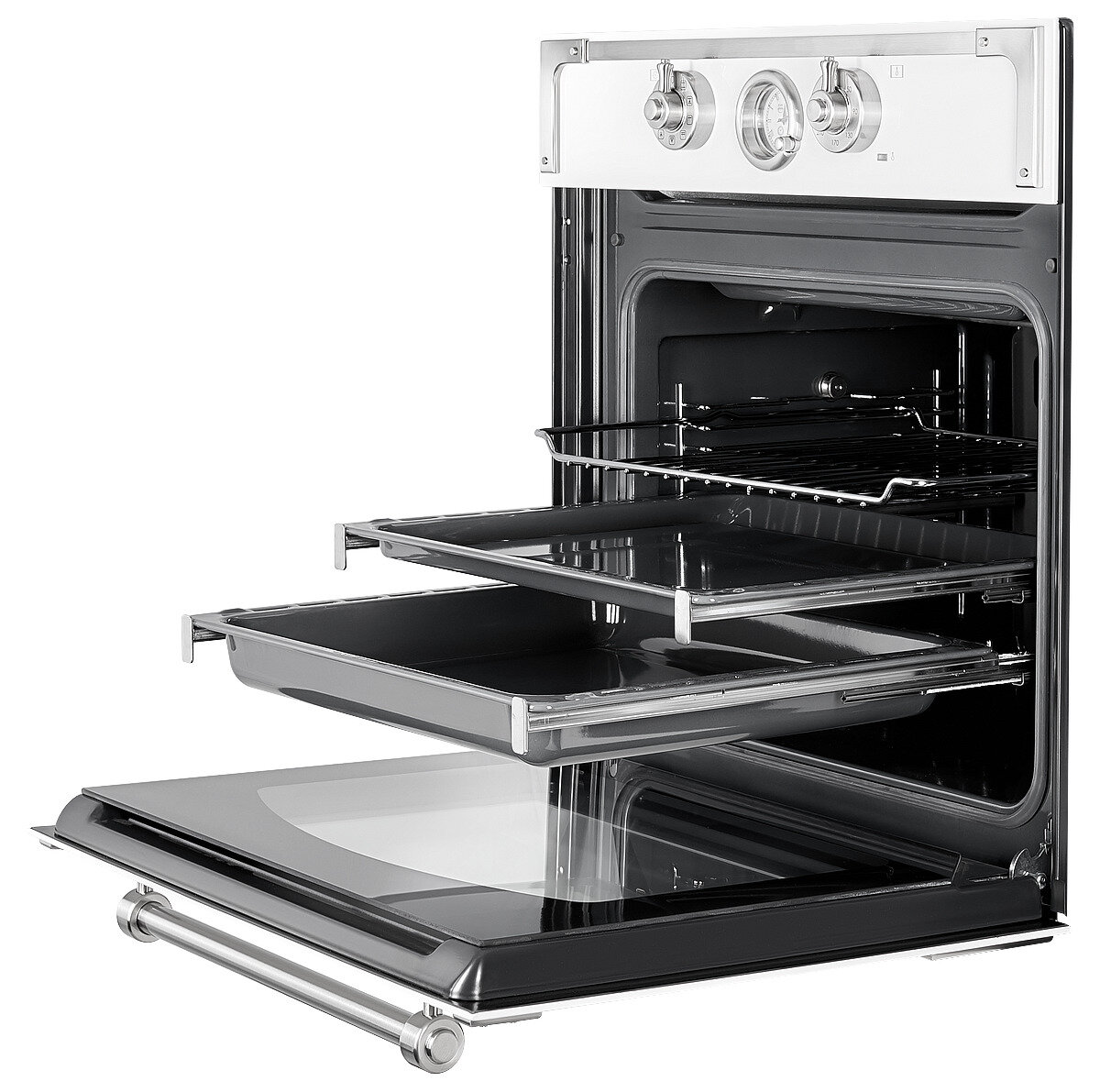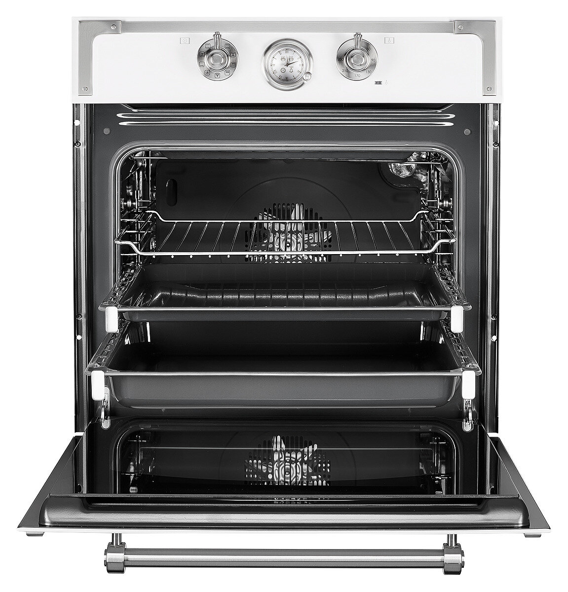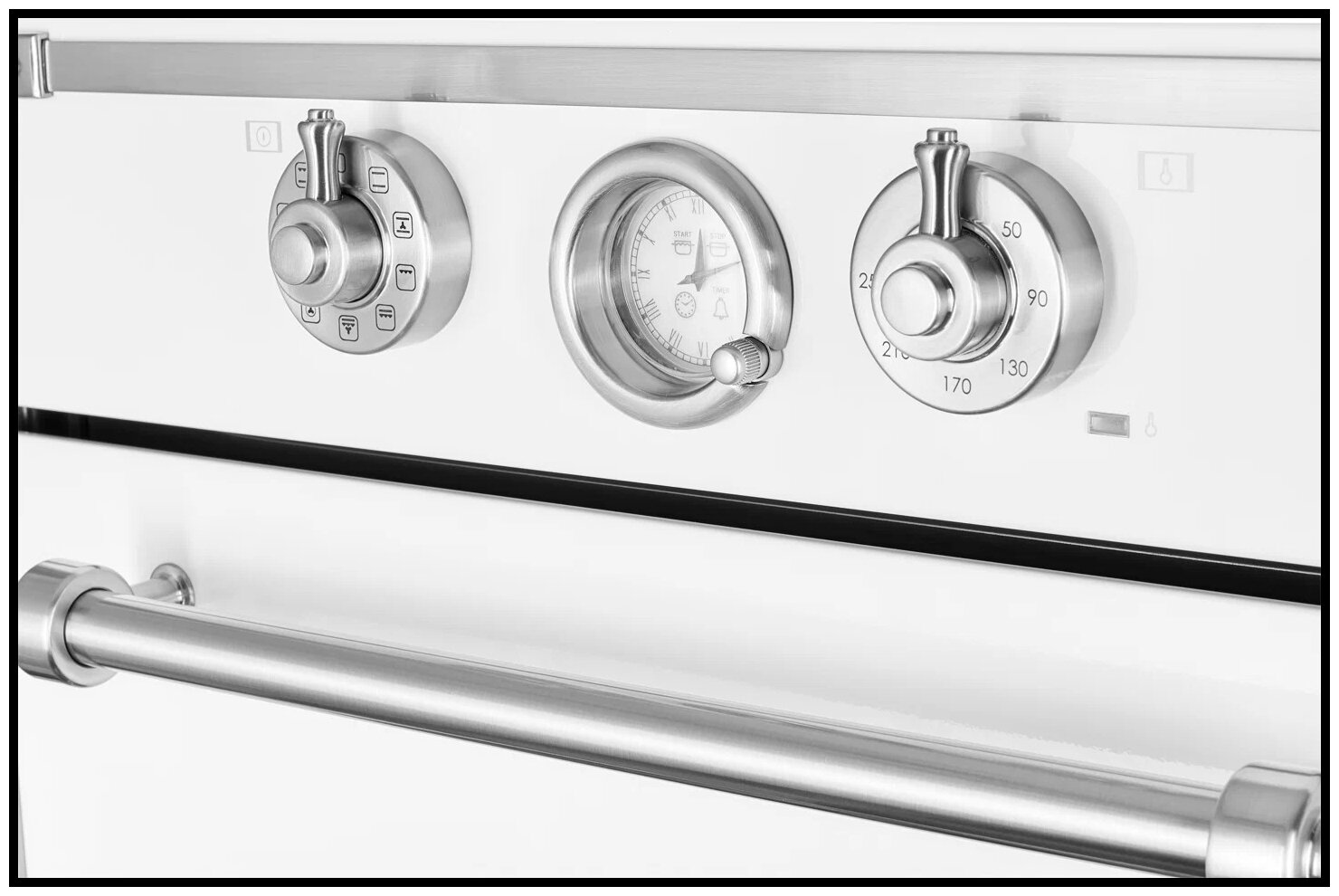 Встроенные часы, Двухуровневое приготовление, Дизайн Ретро, Доводчик дверцы духовки, Полностью стеклянная внутренняя дверца, Хромированные направляющие