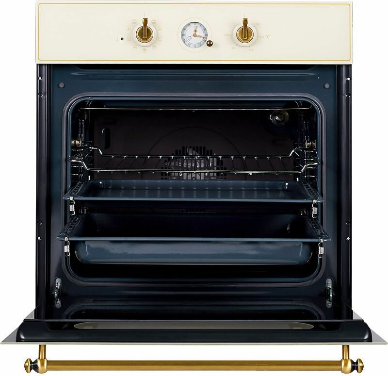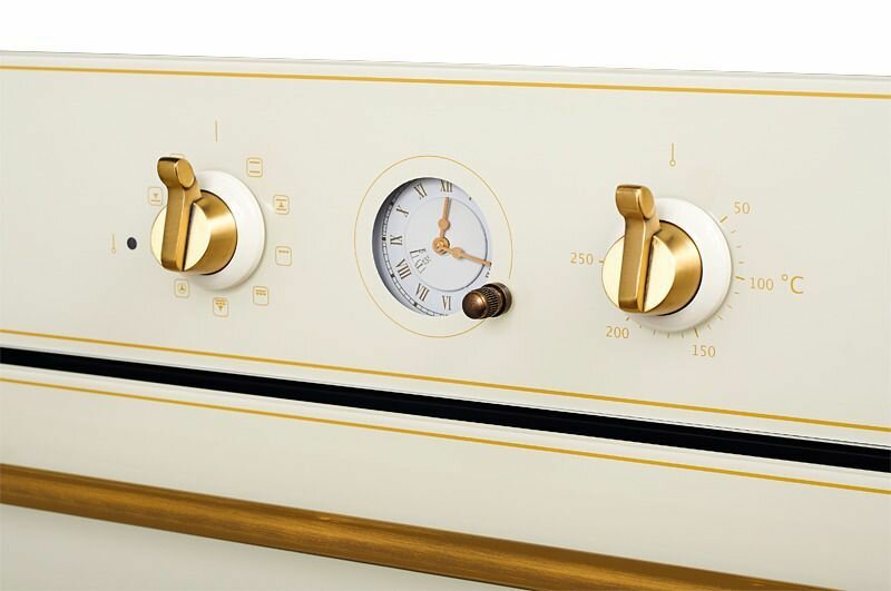 коллекция: Classic; цвет фурнитуры: бронзовый; очистка духовки: гидролизная, каталитическая (задняя стенка); эмаль легкой очистки: Crystal Clean; направляющие для противней хромированные, съемные; съемная дверца духового шкафа, съемное внутреннее стекло; размер ниши для встраивания под столешницу (ВхШхГ), мм: 600×560×570; размер ниши для встраивания в колонну (ВхШхГ), мм: 585(+10)x560×570; тип часов: аналоговые; вентилятор охлаждения; режимы нагрева: традиционный нагрев, гриль, макси-гриль, макси-гриль с конвекцией, турбо режим, нижний нагрев, нижний нагрев с конвекцией, гриль и нижний нагрев, традиционный нагрев с конвекцией
