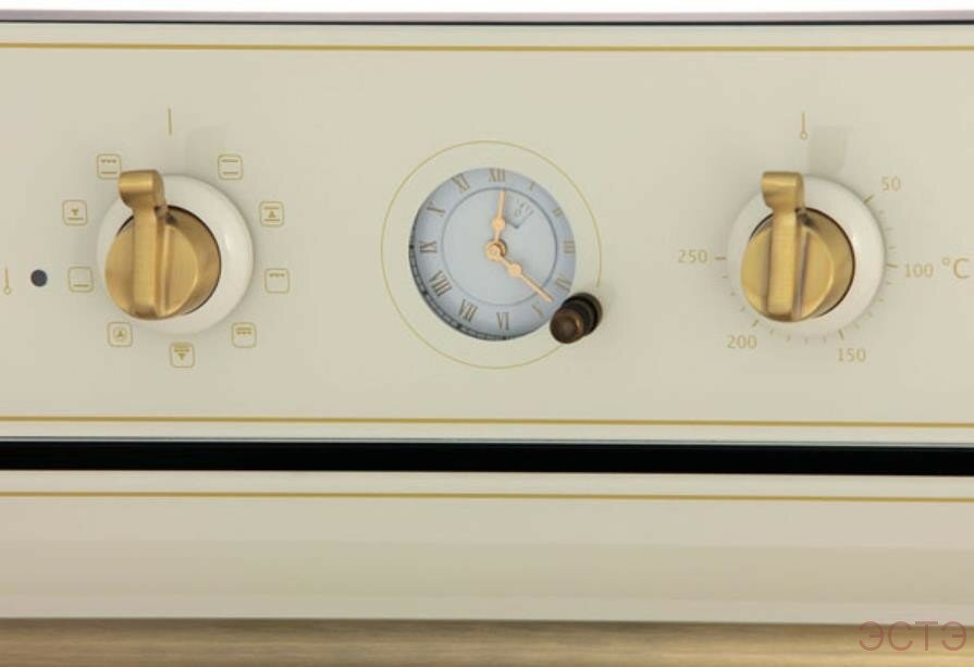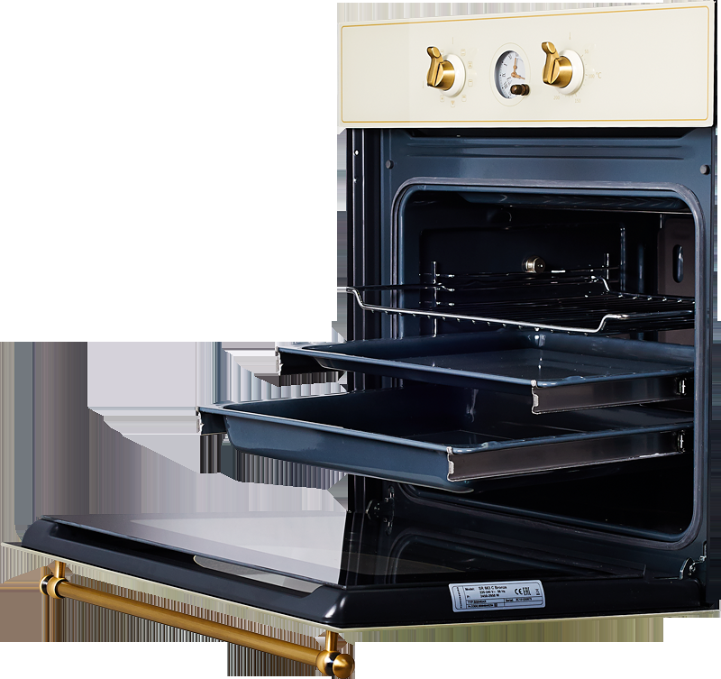 Вентилятор охлаждения, Встроенные часы, Дизайн Ретро, Доводчик дверцы духовки, Полностью стеклянная внутренняя дверца, Хромированные направляющие