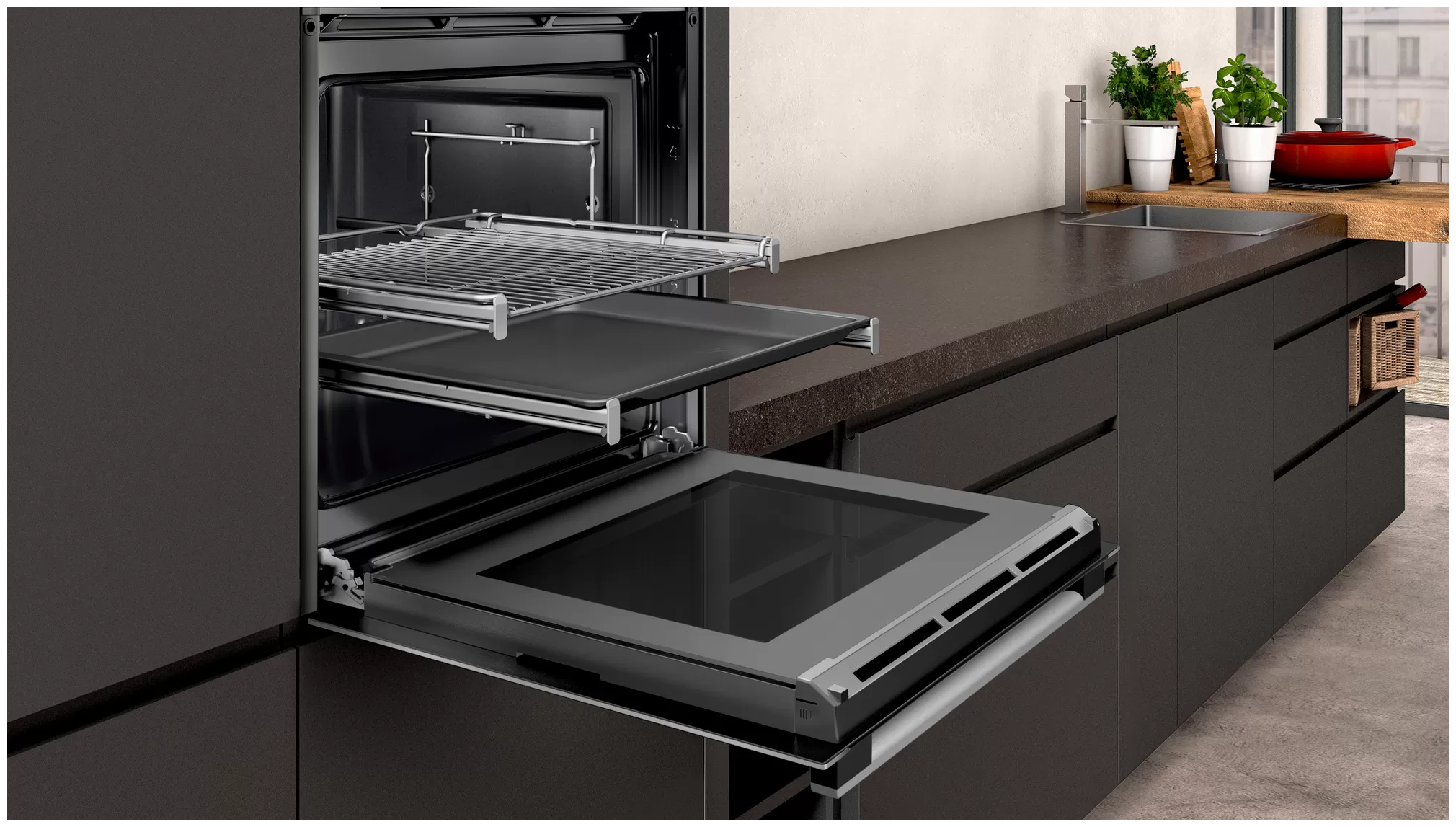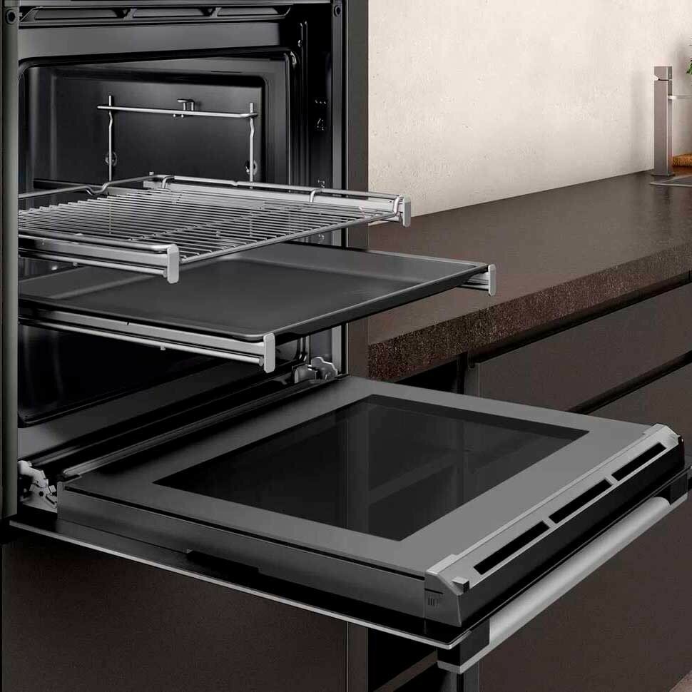 Два уровня оснащаются телескопическими направляющими и стоп-функцией для удобного полного выдвижения. Камера дополнена галогенной подсветкой: вы видите всё, что происходит внутри. Откидная дверца состоит из трёх слоёв стекла, поэтому точно не нагреется выше 40 градусов. Духовой шкаф имеет охлаждающую систему, благодаря которой корпус можно разместить между предметами мебели или встроить в кухонный гарнитур. Боковые, верхняя и задняя стенки имеют особое покрытие, обеспечивающее самоочистку по технологии Eco Clean: поверхность очищается после включения прибора.