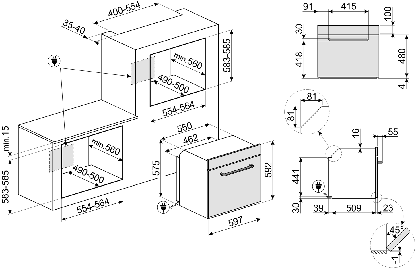 духовой шкаф - 1 шт., температурный щуп, решетка с ограничителем - 1 шт., решетка для противня - 1 шт., противень эмалированный (20 мм) - 1 шт., глубокий эмалированный противень (50 мм) - 1 шт., документация