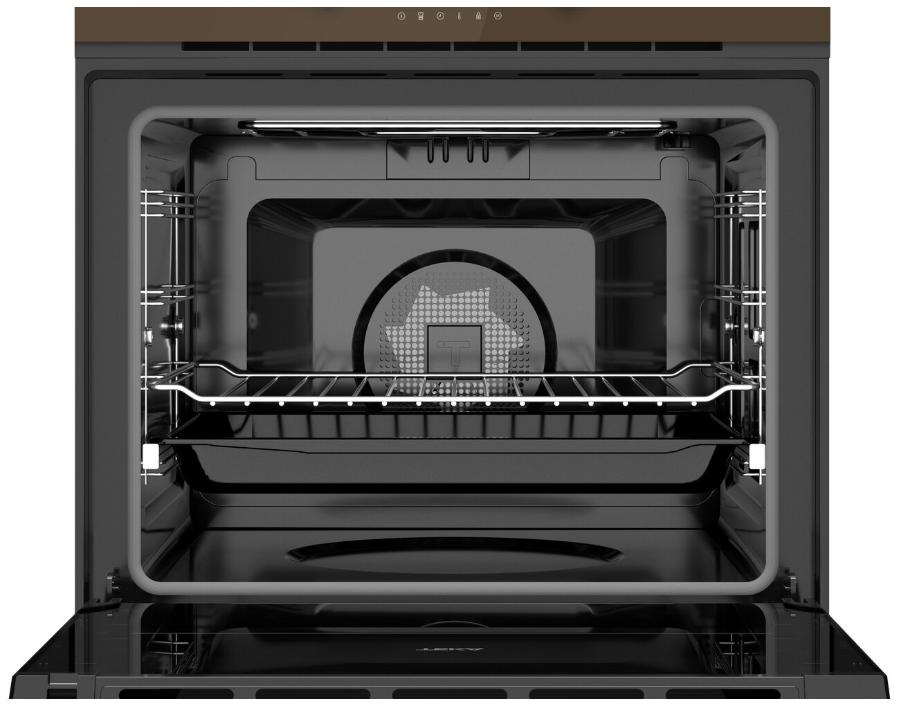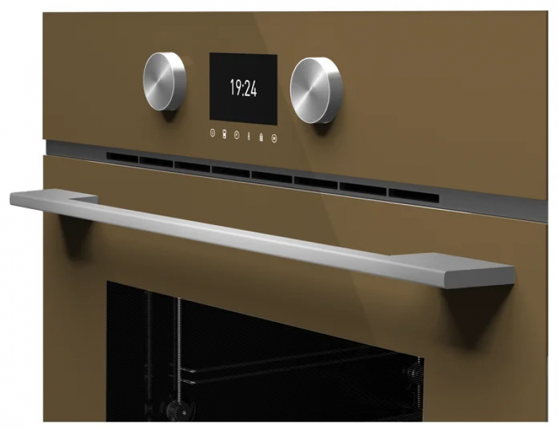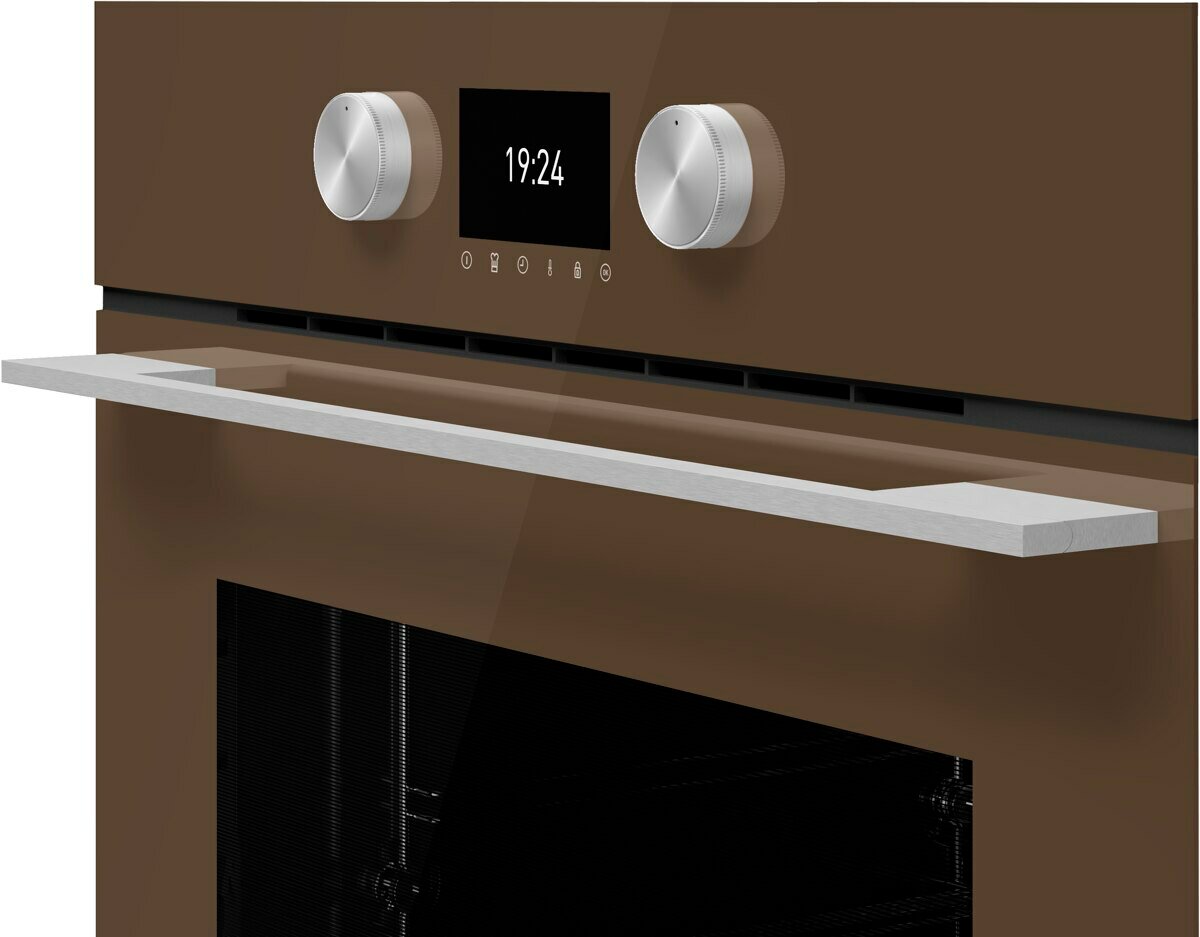 Оригинальный оттенок лондонского коричневого кирпича, стильно дополненный глянцем стеклянной дверцы и контрастным бело-красным ЖК-дисплеем – всё это оценят по достоинству любители интересных дизайнерских решений. Изящные линии, лаконичность и нотки урбанистического стиля позволят органично вписать духовой шкаф в интерьер кухни.