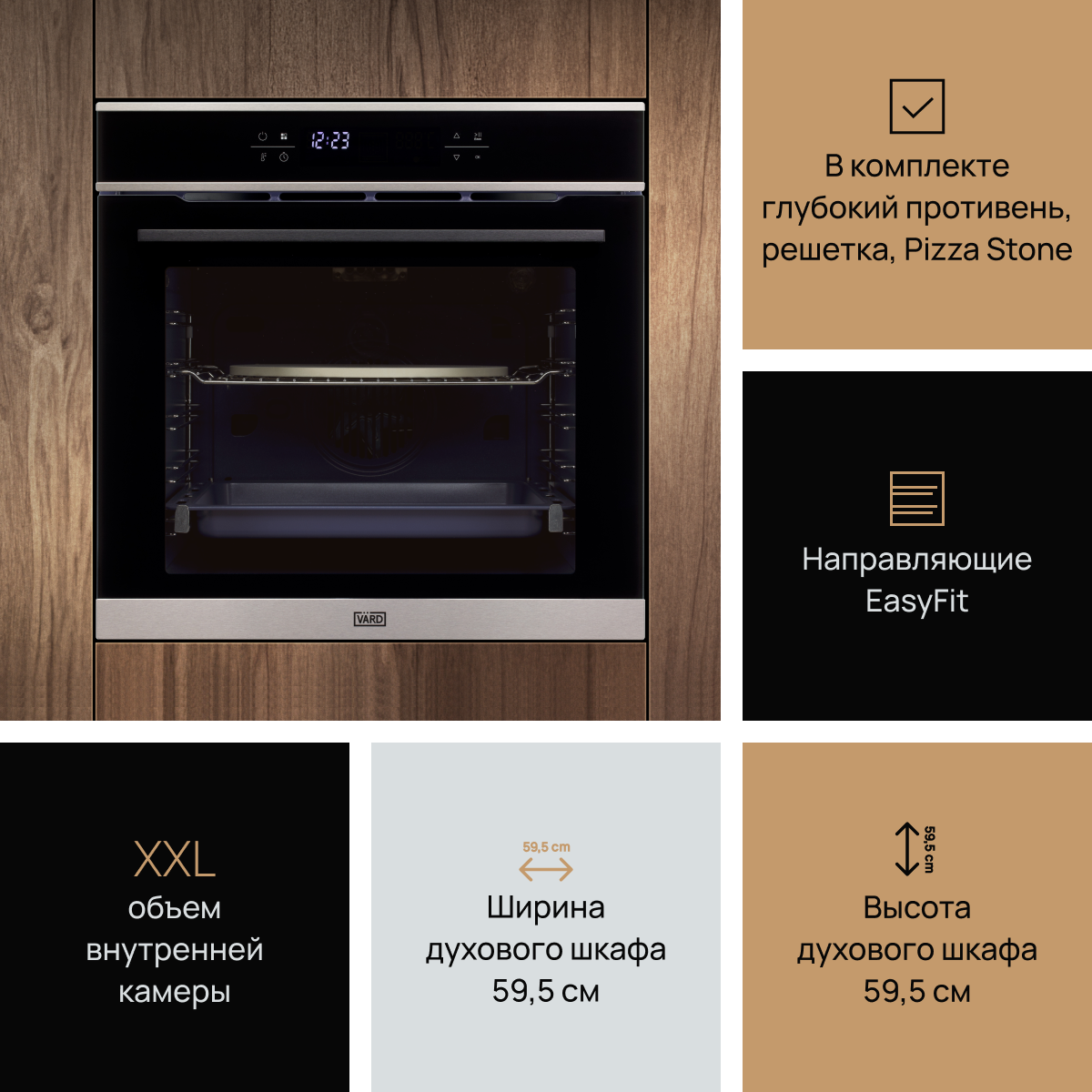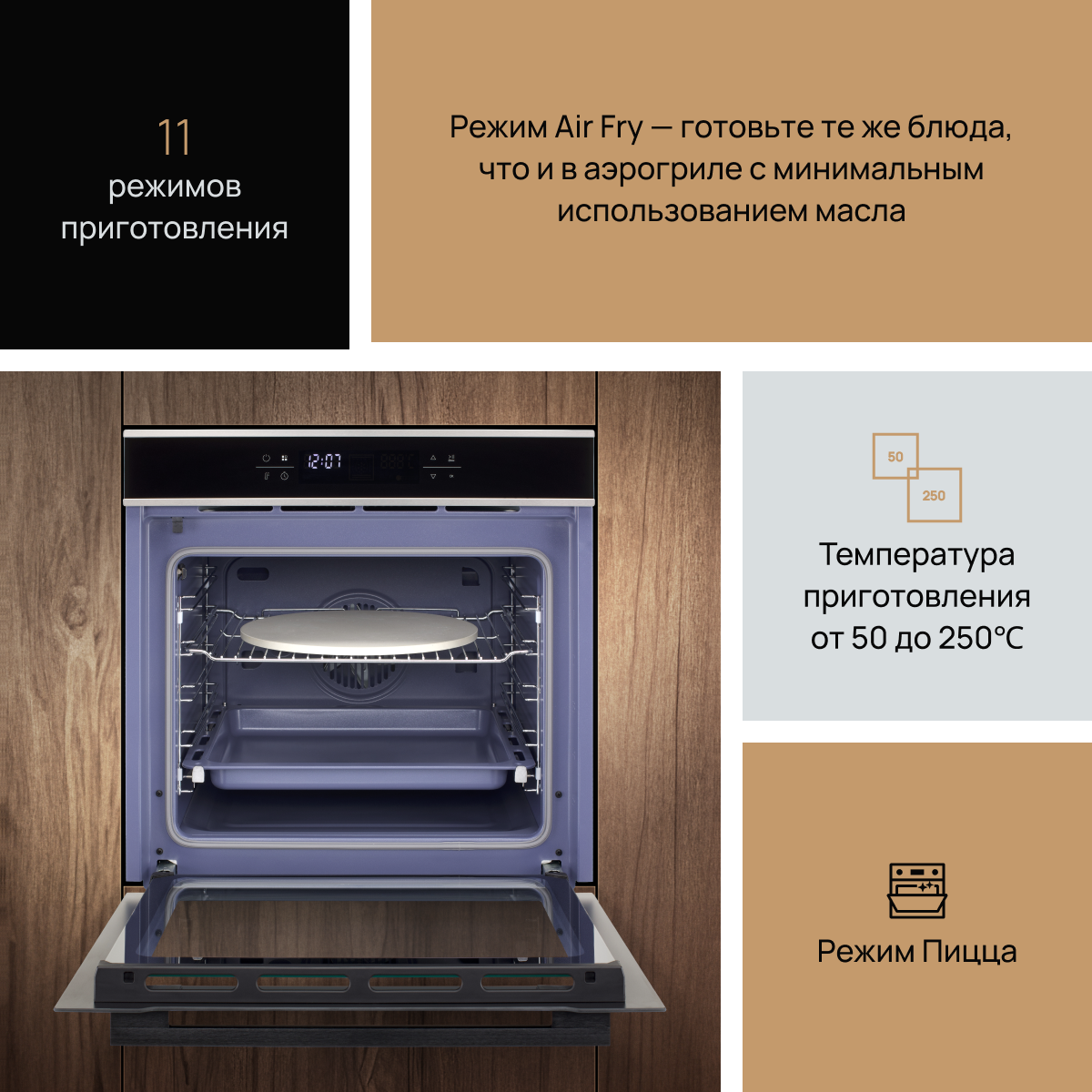 размораживание, таймер, 59.5, Вентилятор охлаждения, Встроенные часы, Дисплей, Доводчик дверцы духовки, Термощуп, Хромированные направляющие