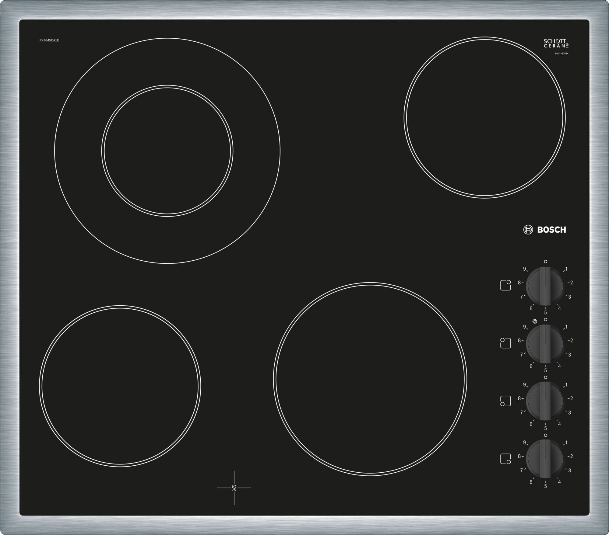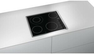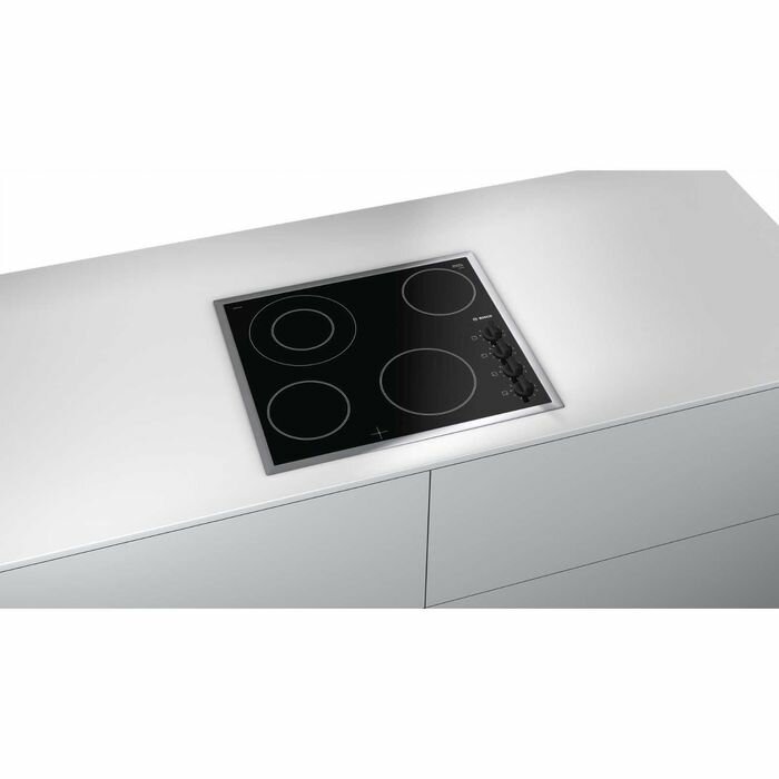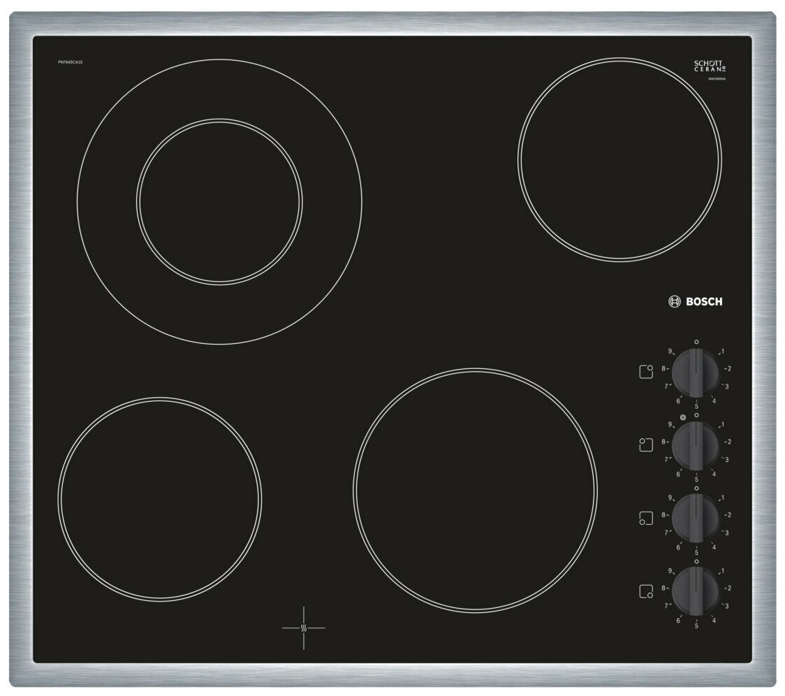 Bosch PKF645CA1E - стеклокерамическая плита с рамой из нержавеющей стали. Это классическое устройство относится к базовой серии Serie 2 и сочетает в себе высочайшее качество с максимальной простотой использования. Четыре конфорки мощностью от 0,75 до 2,2 Вт позволяют готовить любые блюда. Благодаря взаимному расположению посуда особенно удобно размещается на поверхности. Модель отличается механическим управлением и имеет девять уровней регулировки мощности нагрева.