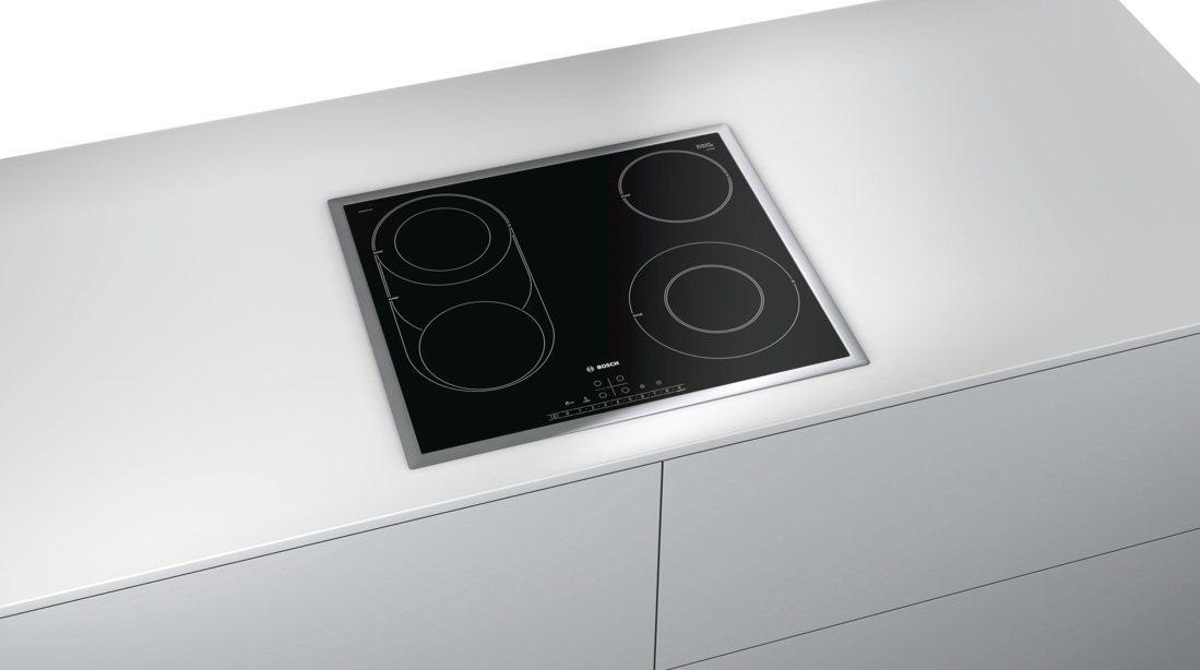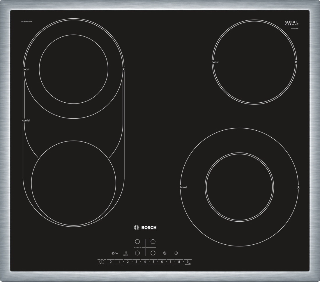 Стеклокерамическая варочная поверхность Bosch PKM645FP1R в рамке из нержавеющей стали, которая предохранит стеклокерамику от сколов. Выглядит эффектно, устойчиво к высоким температурам и не требует особого ухода. Рекомендуется протирать его после каждого использования, иначе остатки пищи могут пригореть.