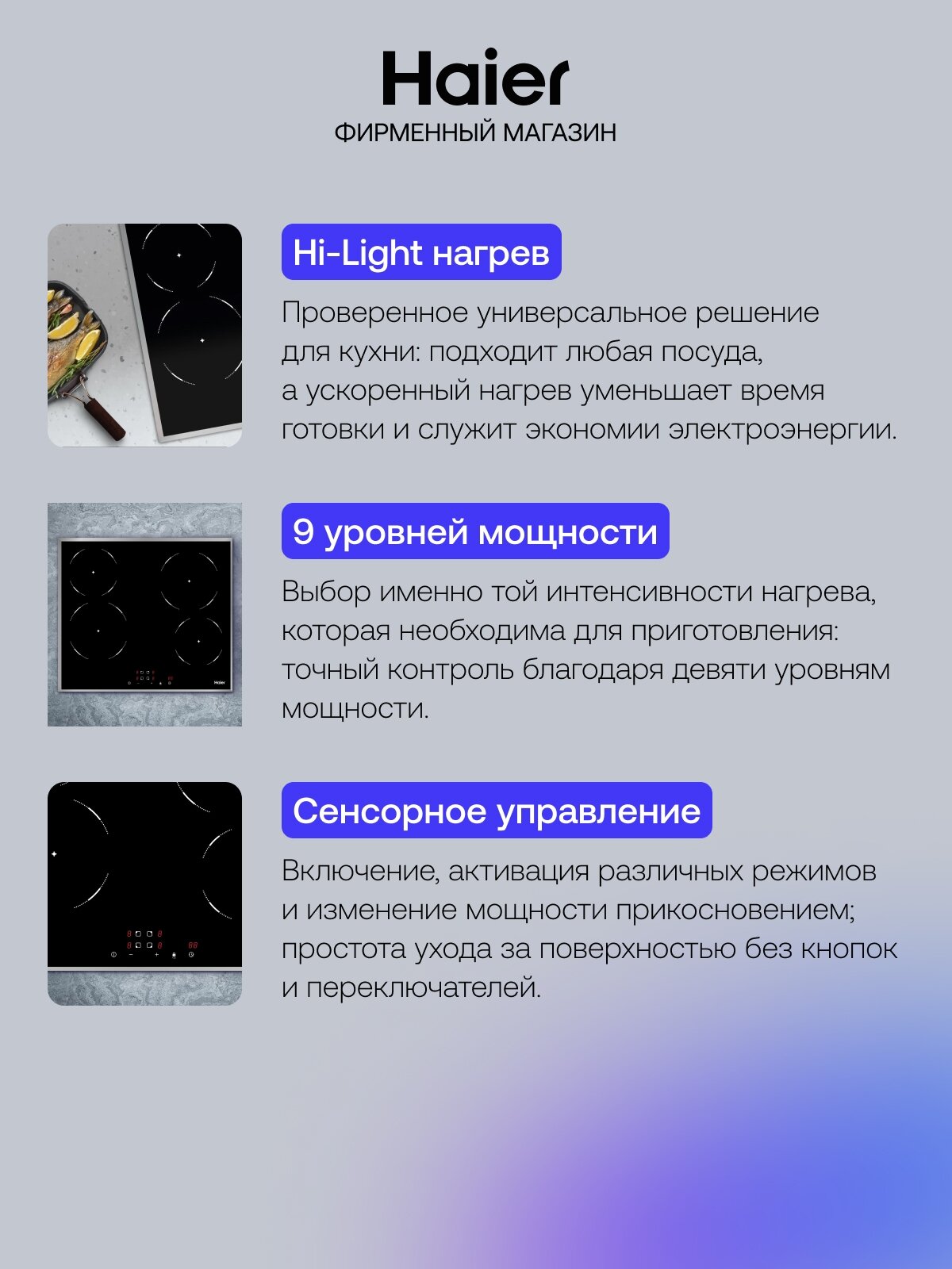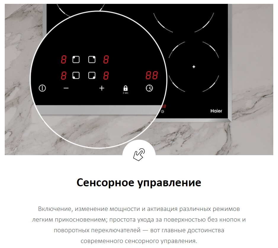 наличие вытяжки, распознавание наличия посуды, таймер, Быстрый нагрев, быстрый нагрев