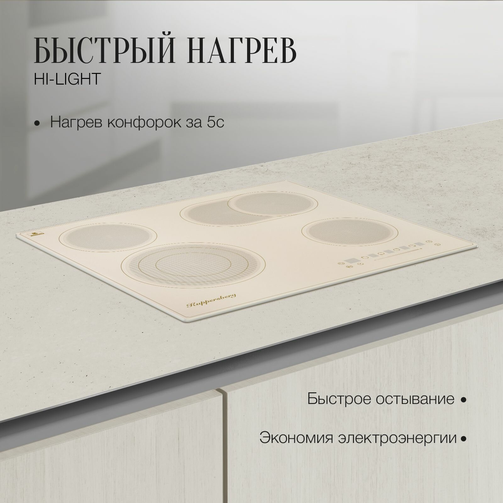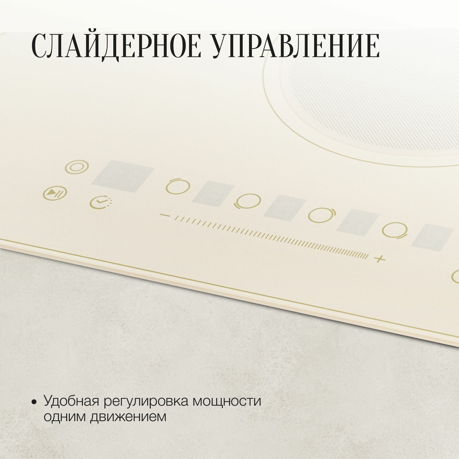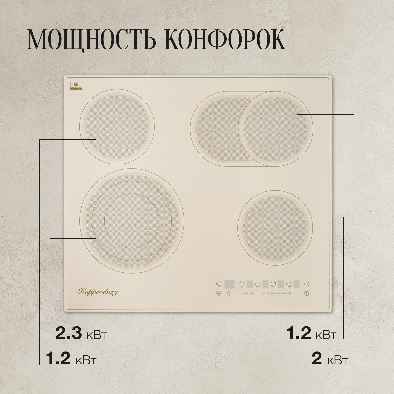 Мощность конфорок, кВт: передняя левая 120−175−230 мм / 0,7−1,5−2,3; Мощность конфорок, кВт: передняя правая 165 мм / 1,2 Мощность конфорок, кВт: задняя левая 165 мм / 1,2 Мощность конфорок, кВт: задняя правая 165−270 мм / 1,1−2,0 Количество цифровых дисплеев - 5, количество уровней мощности - 9, стеклокерамика NEG, Stop and Go, коллекция Classic