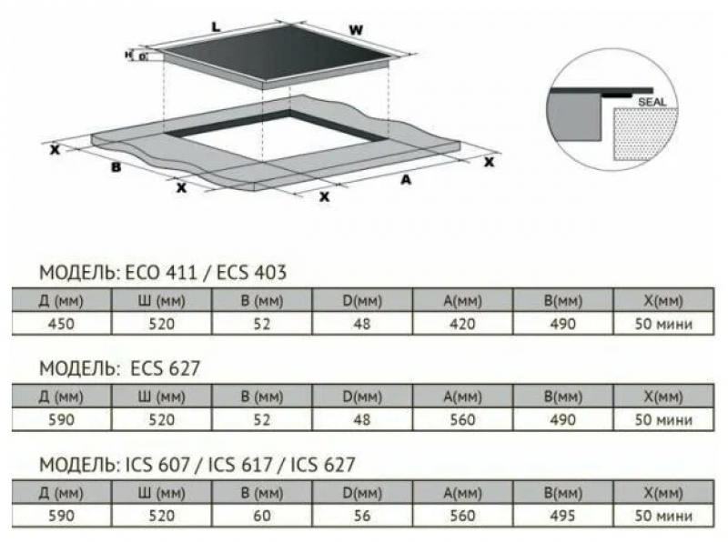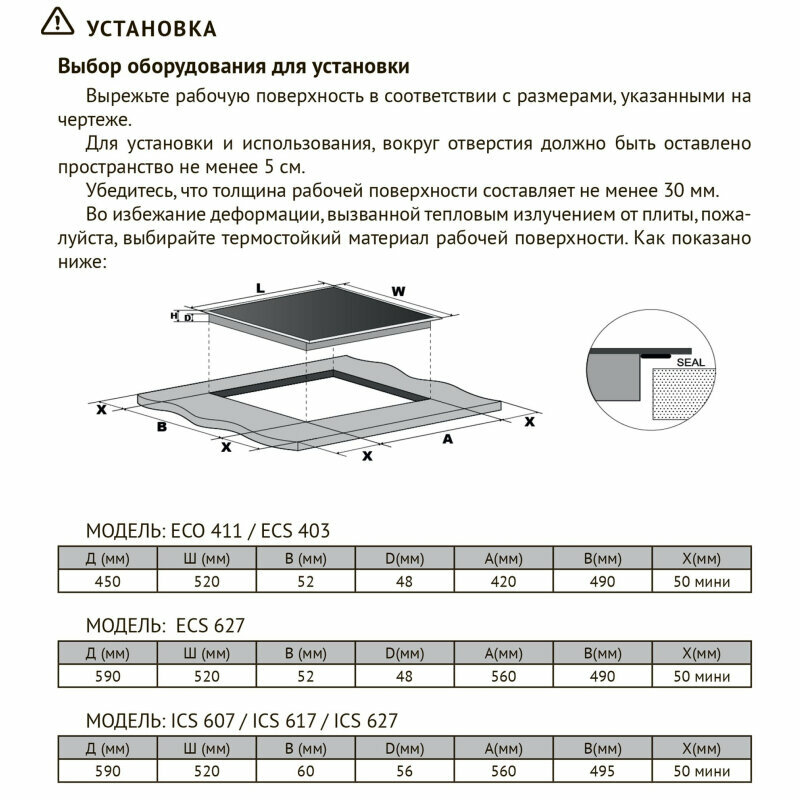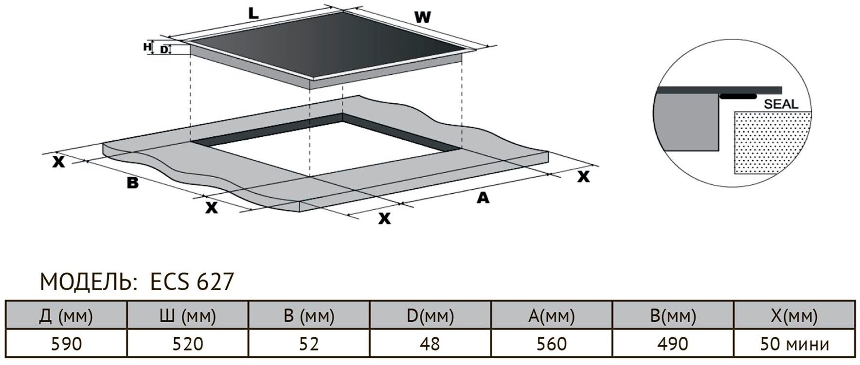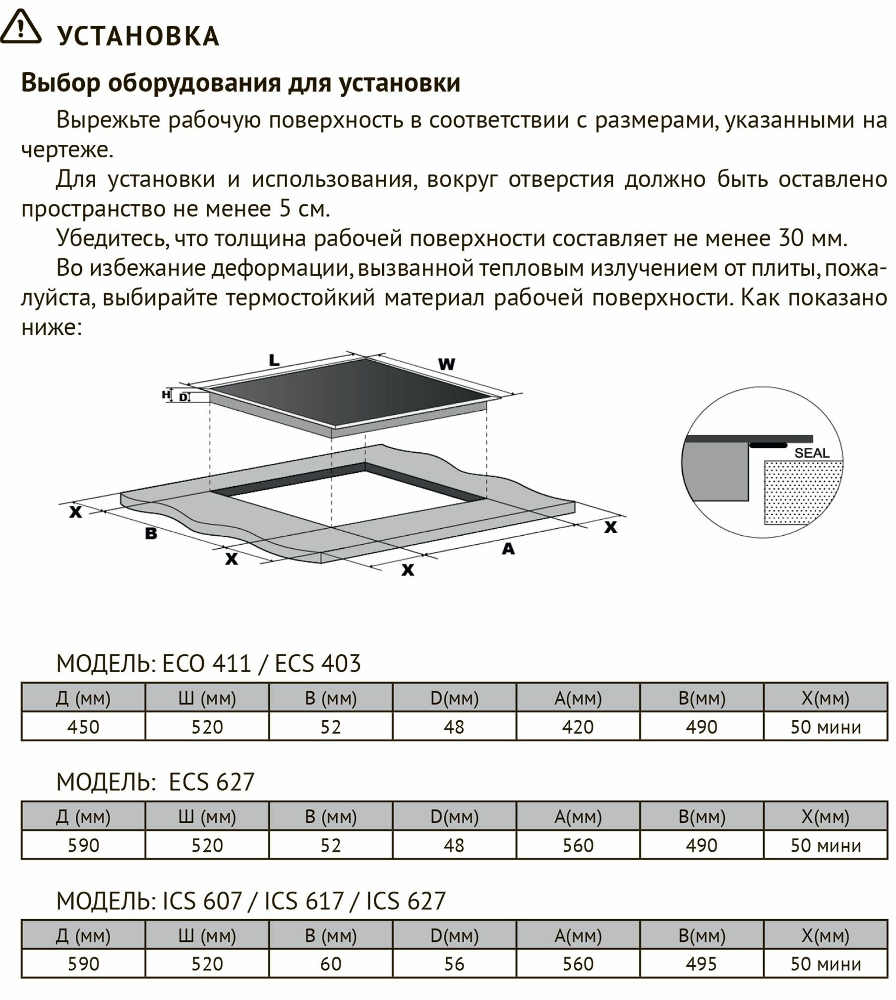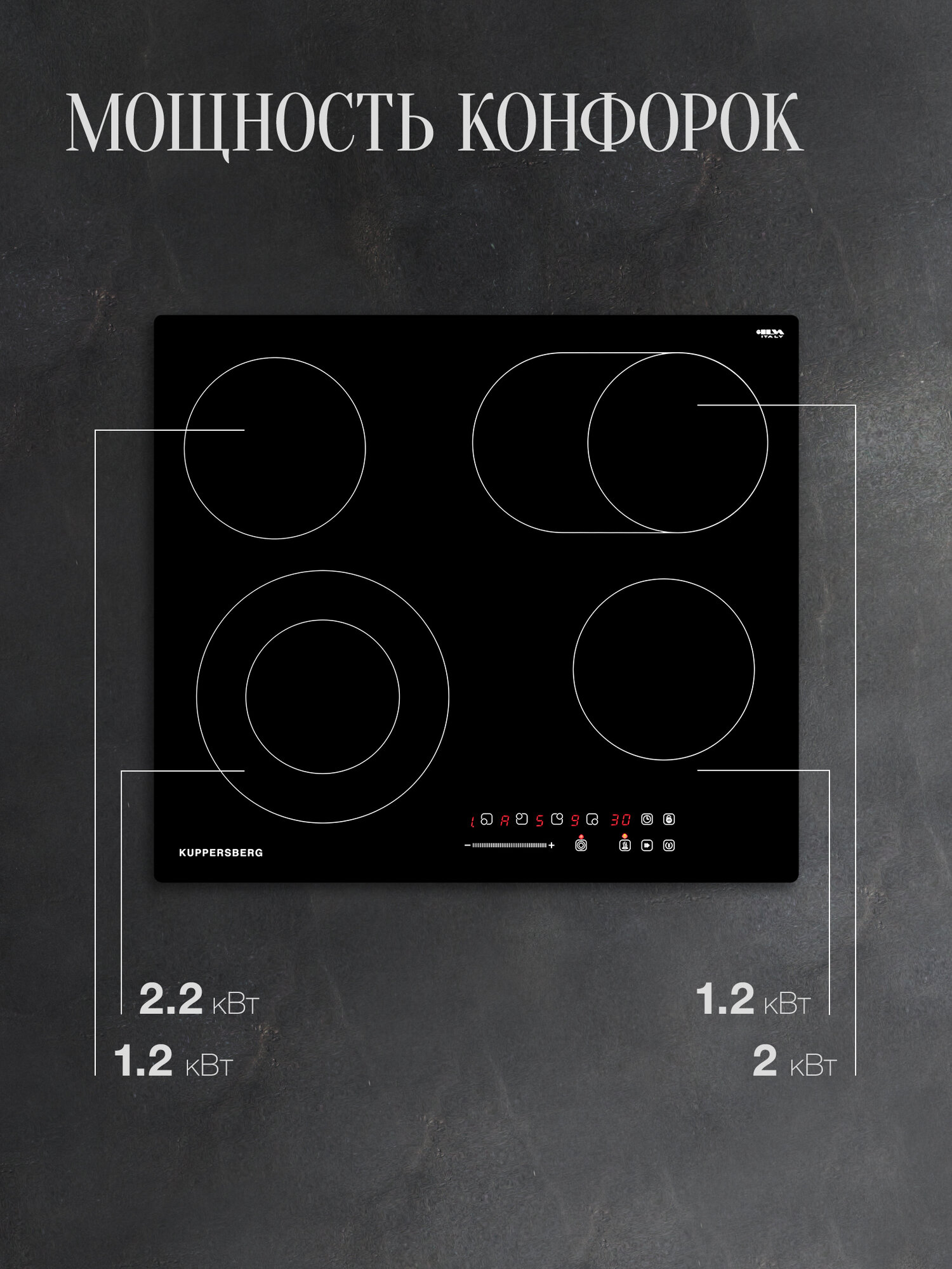 Зоны нагрева: 165mm, 1200W+165mm, 1200W+270x165mm 2000W/1100W, +230mm, 2200/1100W