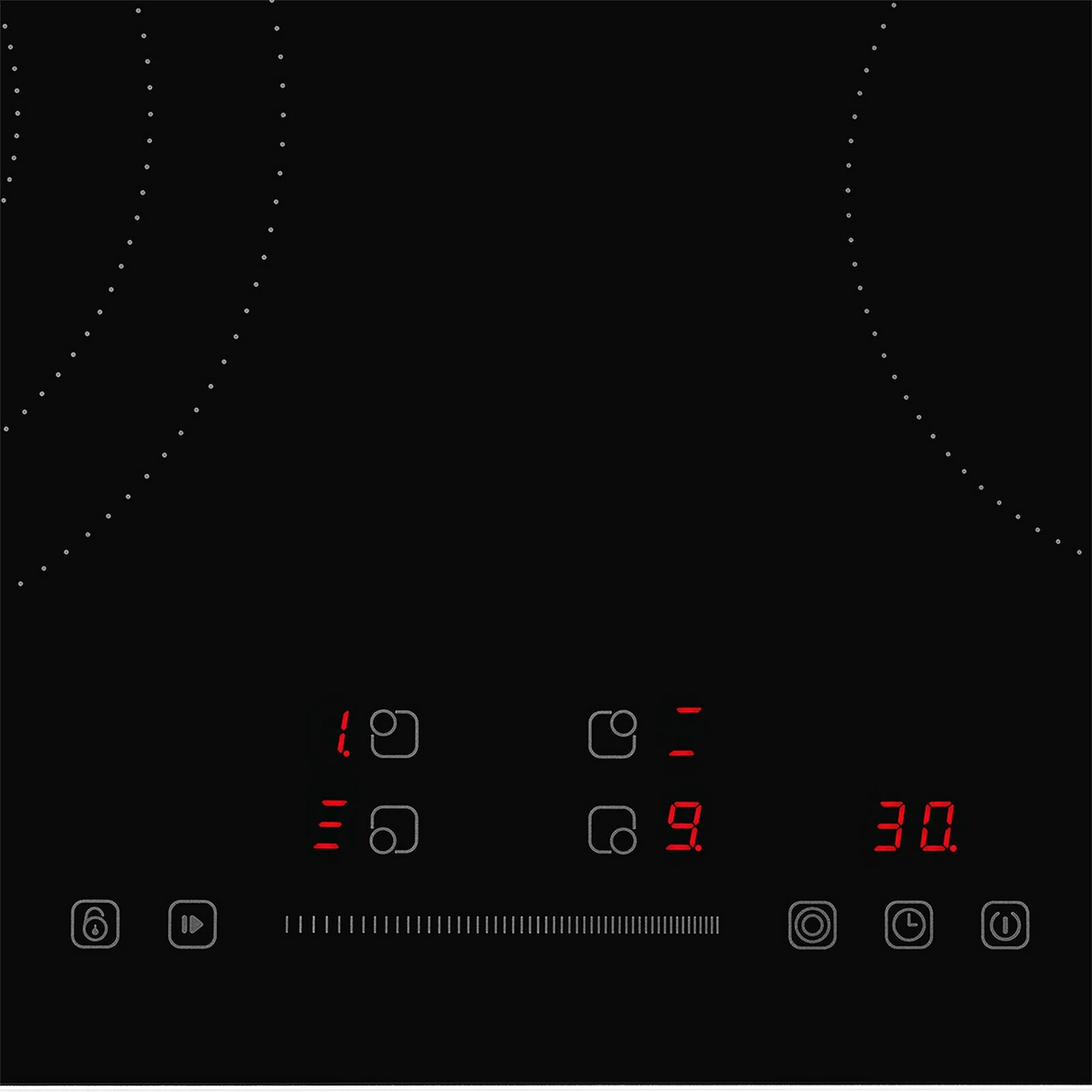 защитное отключение конфорок, индикатор остаточного тепла, кнопка блокировки панели