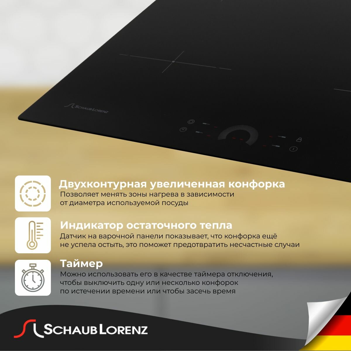 блокировка от детей, индикаторы остаточного тепла, края панели скошенные