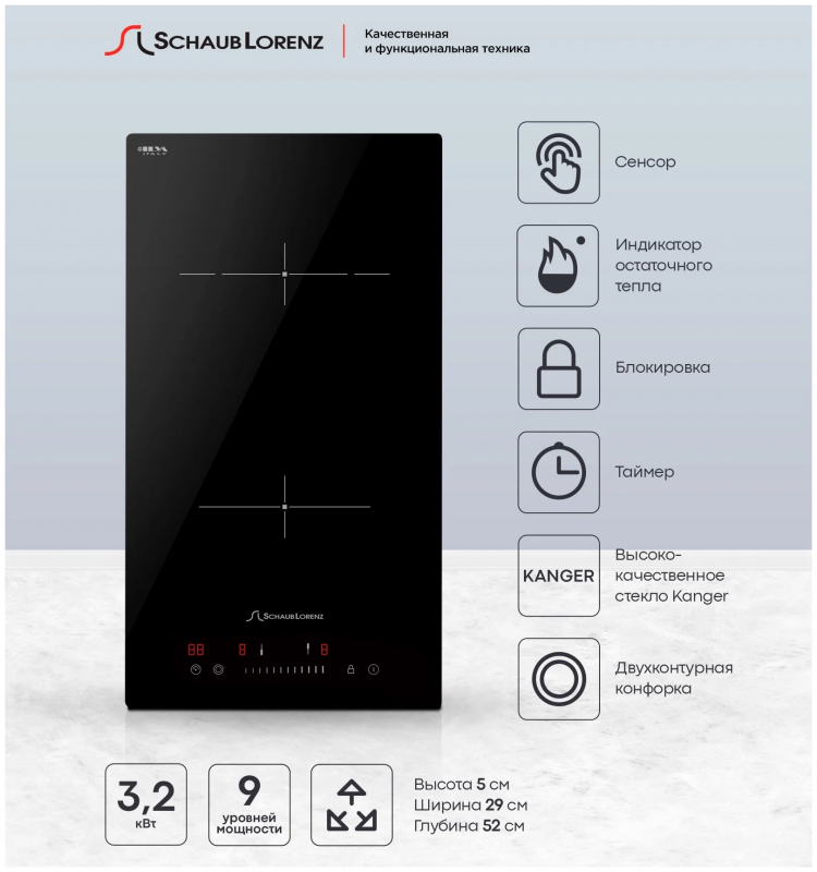 Домино, автоматическое отключение, автоматическое отключение, Домино, блокировка от детей, индикаторы остаточного тепла, скошенные края конфорок, цифровой дисплей