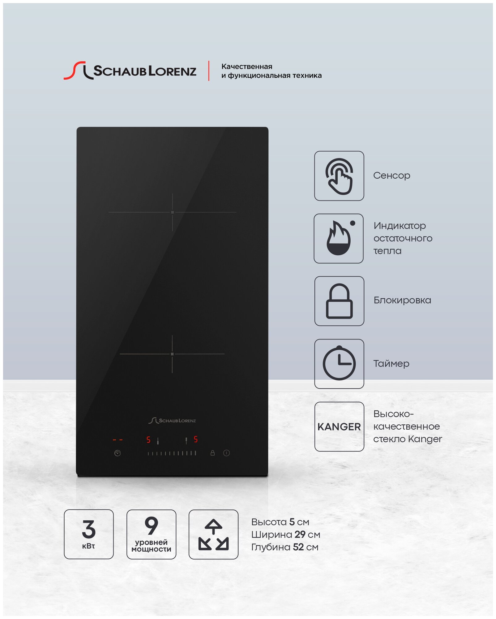 Домино, автоматическое отключение, блокировка от детей, индикаторы остаточного тепла, края панели скошенные