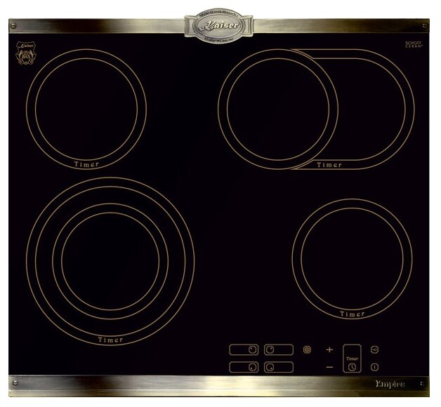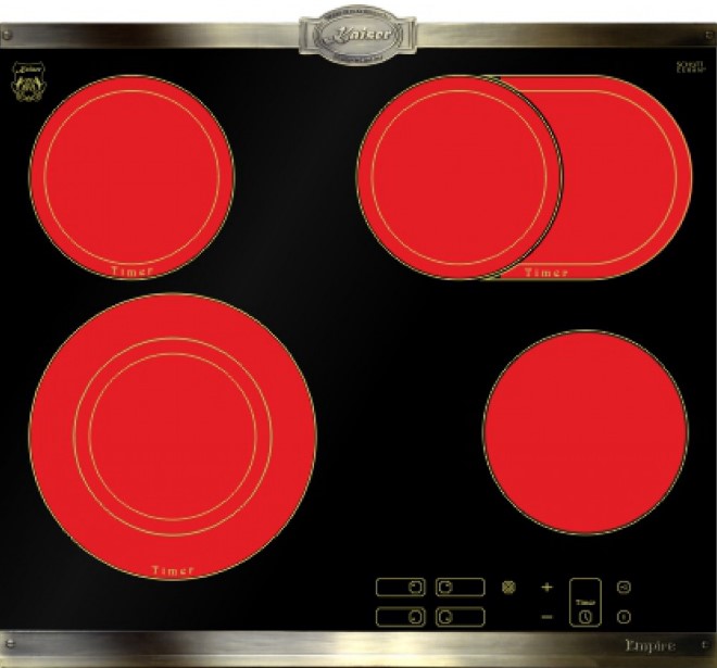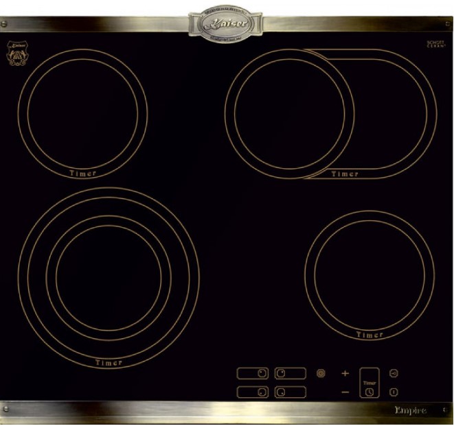Независимая варочная поверхность Kaiser KCT 6385 Em из линейки Empire в цвете антрацит изготовлена из ударопрочной керамики. Украшение износостойкой графикой и массивными бронзовыми пластинами придает панели индивидуальность.