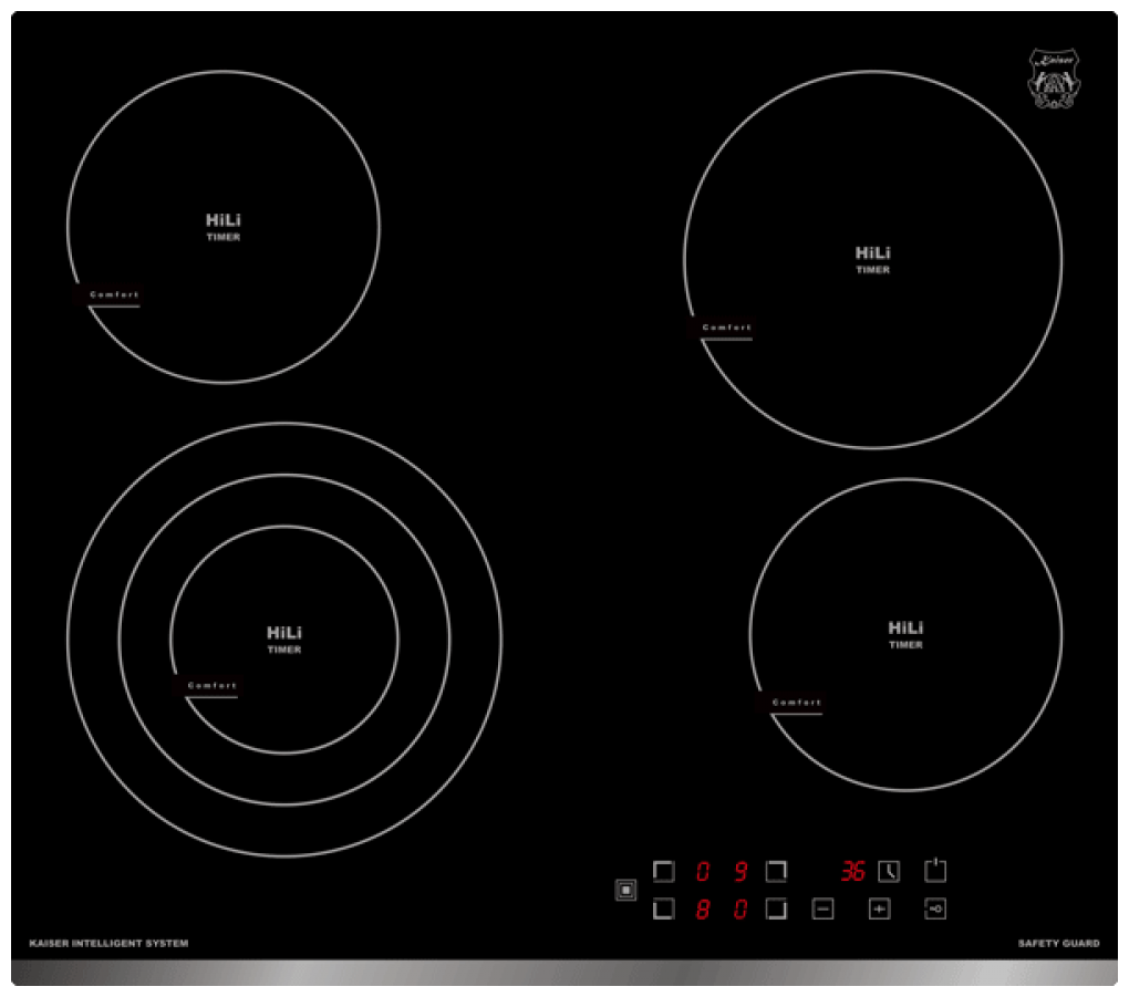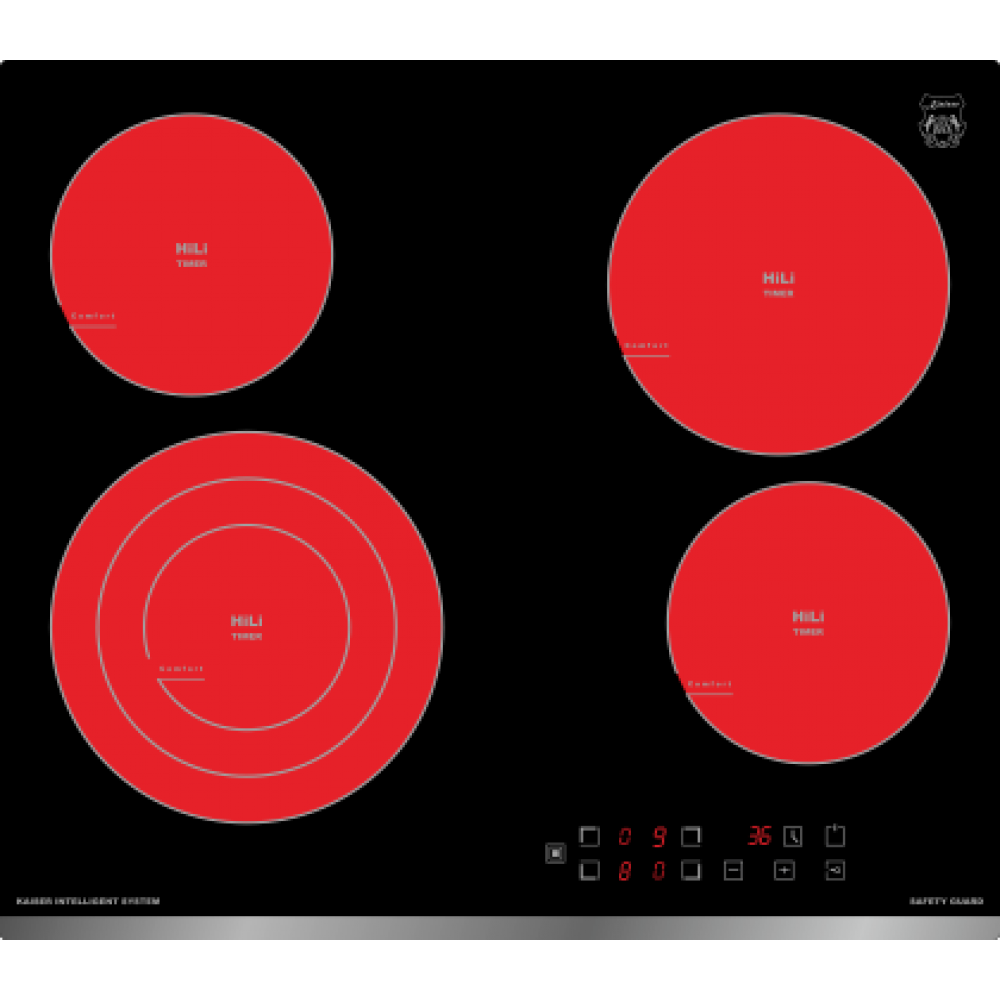 Независимая варочная панель Kaiser KCT 6703 F оснащена четырьмя конфорками, одна из которых трехконтурная. Цифровой дисплей позволяет точно настроить нагрев. Полностью сенсорные элементы управления и таймер для каждой конфорки упрощают использование прибора.