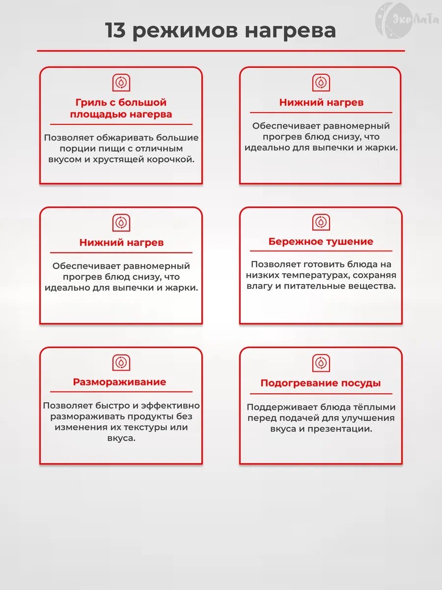 большой гриль, верхний нагрев, верхний нагрев + конвекция, верхний нагрев + нижний нагрев, верхний нагрев + нижний нагрев + конвекция, гриль, гриль + конвекция, конвекция, малый гриль, нижний нагрев, нижний нагрев + конвекция, 4D - нагрев, true, Верхний + нижний нагрев + конвекция, Верхний + нижний нагрев + турбо режим, Верхний нагрев + гриль, Верхний/нижний нагрев, Верхний/нижний нагрев Eco, Гриль + вентилятор, Гриль + нижний нагрев, Гриль + нижний нагрев + вентилятор, Конвекция Eco, Нижний нагрев + Турбо (Пицца), Поддержание температуры, Подогрев посуды, Приготовление при низкой температуре, Размораживание, Режим Пицца, Турбо гриль