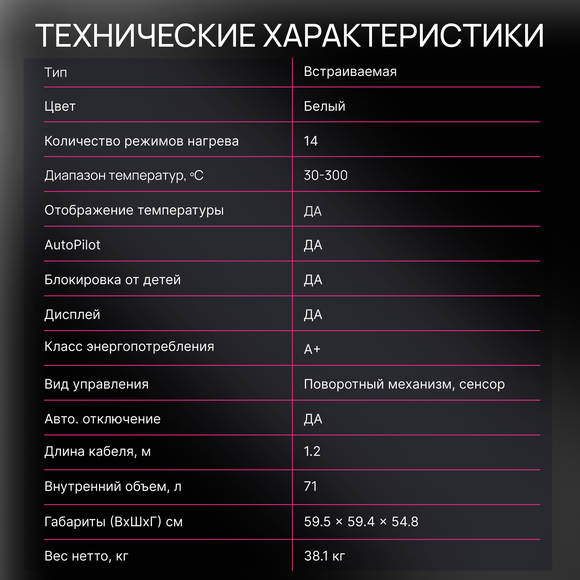 быстрый нагрев, поддержание тепла, подогрев посуды, размораживание, таймер, 59.5, Вентилятор охлаждения, Встроенные часы, Дисплей, Термощуп, Хромированные направляющие