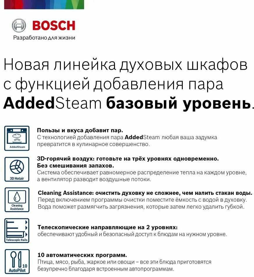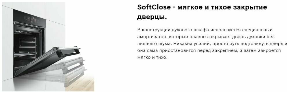 быстрый нагрев, добавление пара, поддержание тепла, размораживание, таймер, функция пароварки, Вентилятор охлаждения, Встроенные часы, Двухуровневое приготовление, Дисплей, Доводчик дверцы духовки, Освещение духовки, Термощуп, Утапливаемые переключатели, Хромированные направляющие