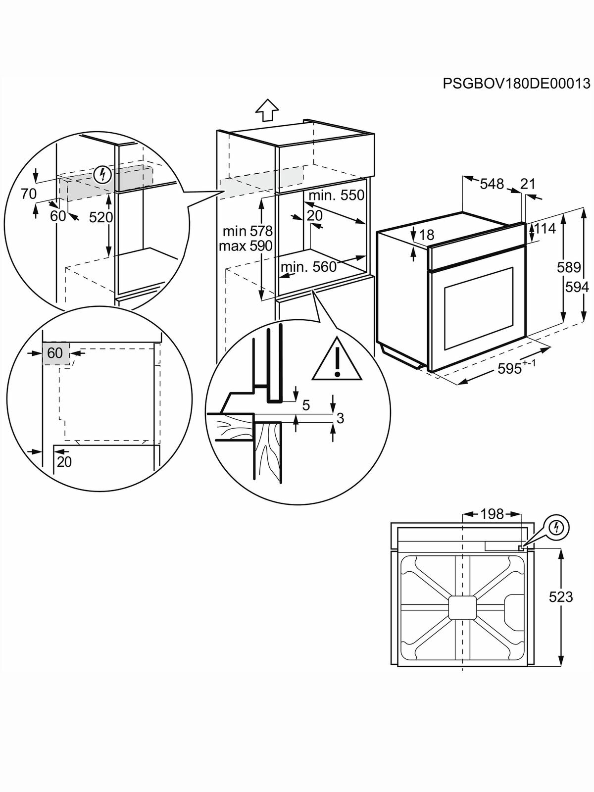 ширина и высота шкафа для встраивания: 60 см; мощность нижнего нагревателя: 1000 Вт; мощность верхнего нагревателя: 800 Вт; мощность нагревателя гриля: 1300 Вт; температурный диапазон: 50 - 250 °C; длина кабеля: 1,1 м