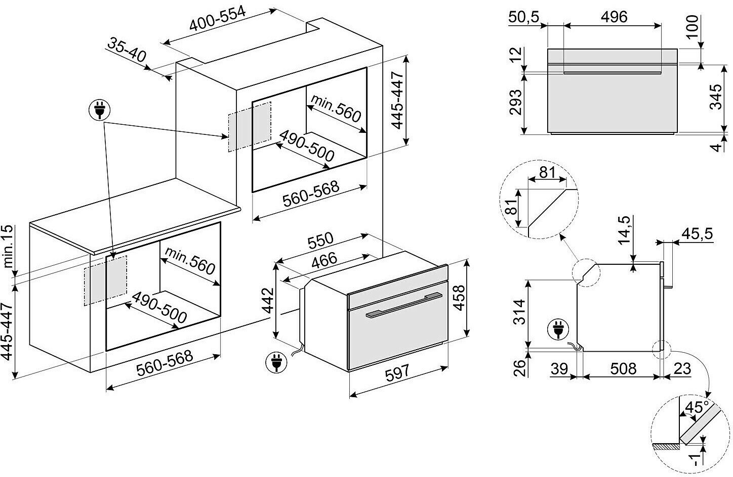вес - 32,8 кг, приготовление с паром, самодиагностика неисправностей, тип освещения - галогеновое, размер ниши (в*ш*г) - 447*564*560 мм, внутреннее покрытие - эмаль легкой очистки, телескопические направляющие - дополнительная опция, режимы работы духовки - 12, материал фронтальной панели - стекло